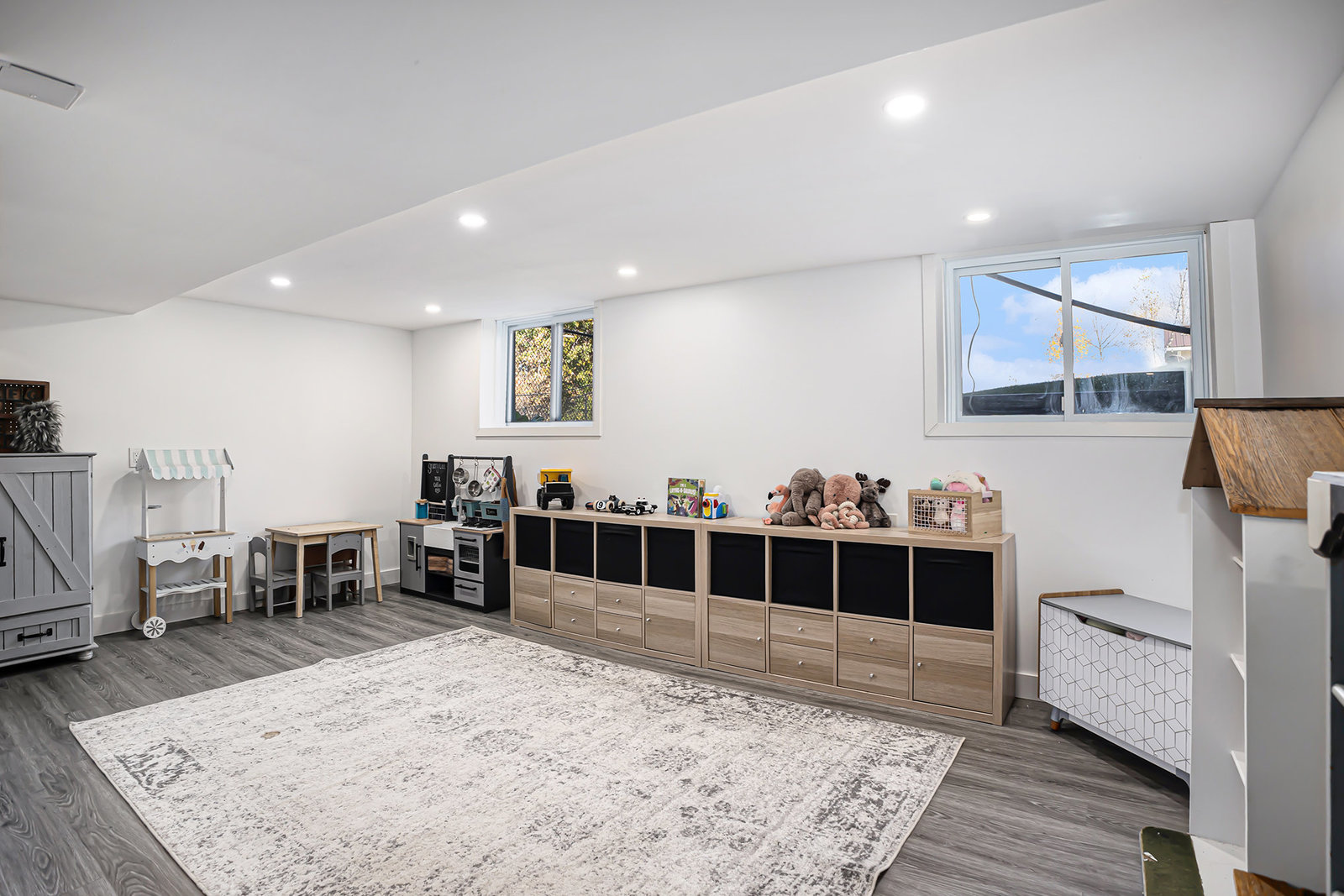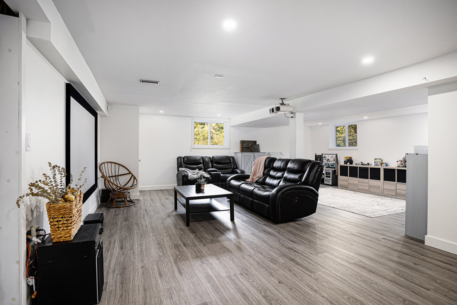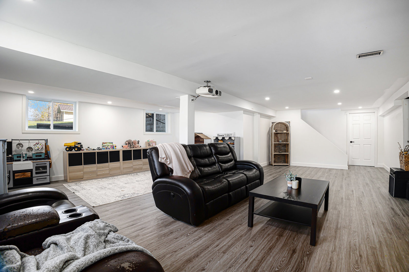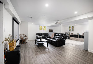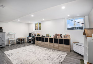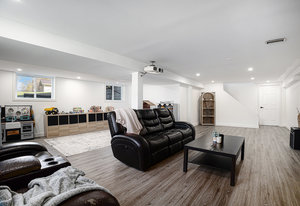 The finished basement adds valuable living space, featuring a large recreational room with durable vinyl plank flooring—an excellent spot for game nights, movie evenings, or a kids’ play area. The basement’s versatile layout accommodates a range of family activities and hobbies.