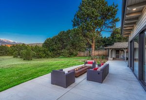 Outdoor living is equally compelling, with a rear patio centered around a custom corten steel 8-foot firepit and newly landscaped grounds featuring mature piñon, ponderosa, and bottlebrush pine trees. A 9-zone Rachio irrigation system supports the lush setting, while available plans offer flexibility for future expansion.