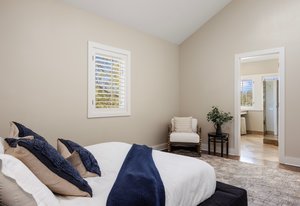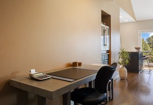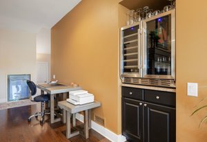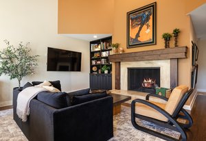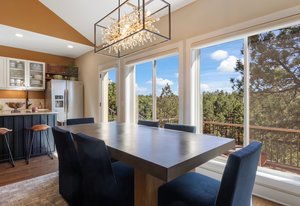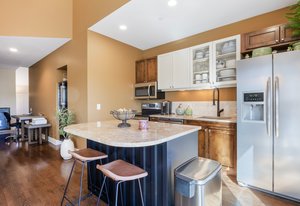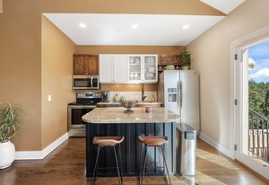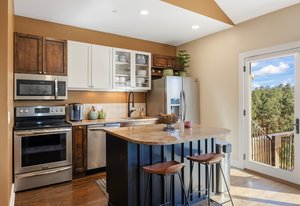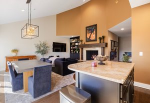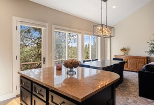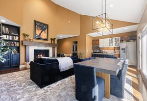 Inside, an open layout with vaulted ceilings and southwest-facing windows fills the space with warm, natural light. Fine details — hardwood floors, a built-in wine fridge, and a marble wood-burning fireplace — add a touch of sophistication. The kitchen features granite countertops, a center island, and newer stainless appliances.