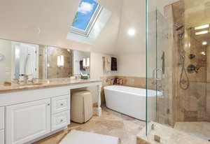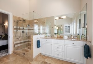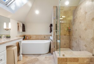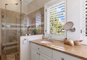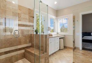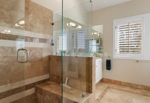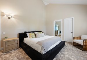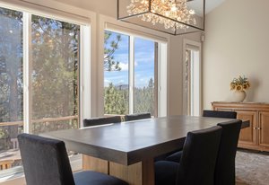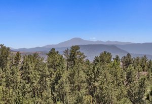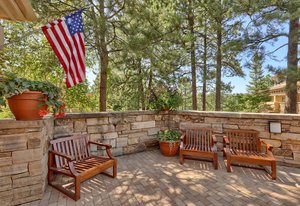 The main living area opens to a secluded brick paver deck overlooking the pines with a peaceful mountain view — an ideal setting for morning coffee or evening sunsets. The primary suite evokes a romantic spa, with an oversized shower and freestanding soaking tub.