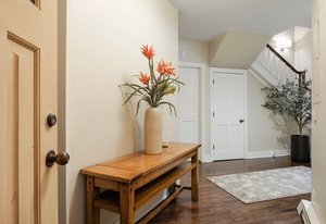 Enter through the welcoming first-floor foyer, then ascend to the main living area above. Tucked at the end of a charming stone-walled lane lined with seasonal flowers and gardens, the property offers exceptional privacy and natural beauty.
