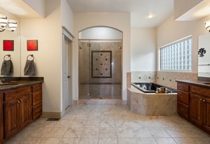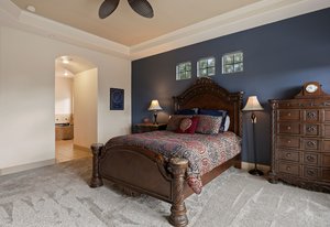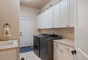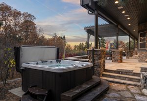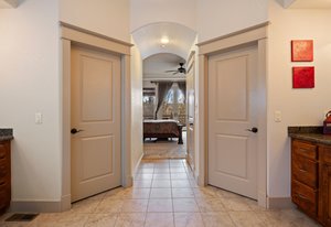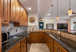 The main-level primary suite opens directly to the expansive upper deck—ideal for morning coffee with a view. The luxurious en-suite bath features dual vanities, a soaking tub, walk-in shower, and two generous closets. A second en-suite bedroom on the main level provides excellent flexibility for guests, along with a large, dedicated office and a well-appointed laundry room with abundant cabinetry and utility sink.