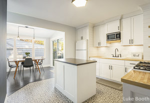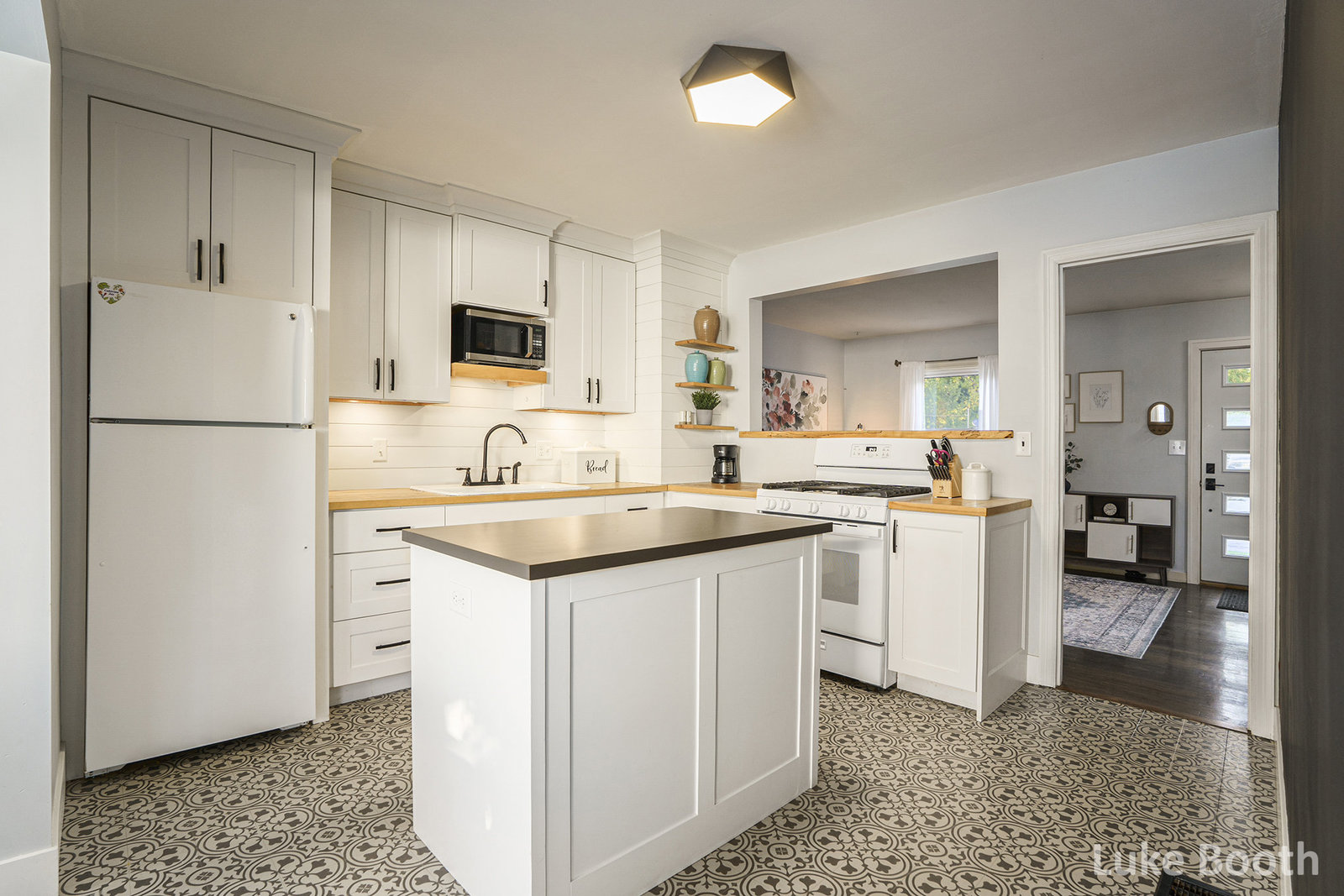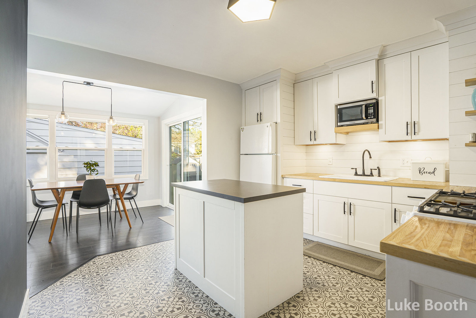 • Updated Kitchen & Dining Area: The kitchen features ceiling-height cabinets, an island with the dishwasher built in, and an opening to the living room with a live-edge wood ledge - perfect for serving, chatting, or enjoying a morning coffee. Dining room remodeled with a slider door onto the deck for easy outdoor dining or relaxing.