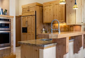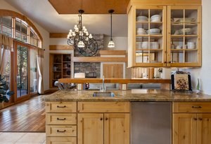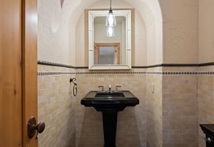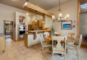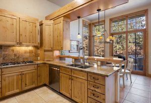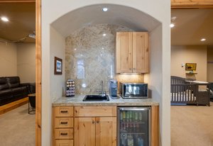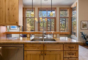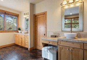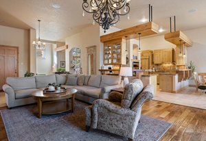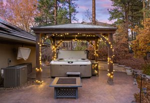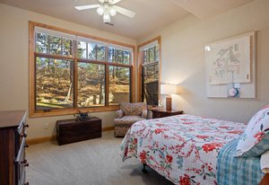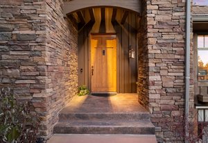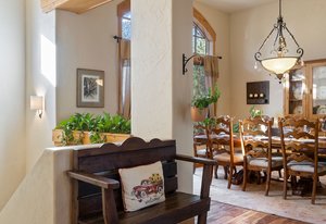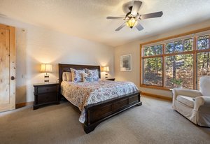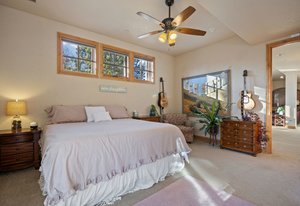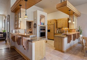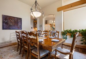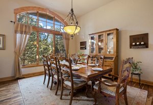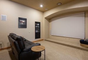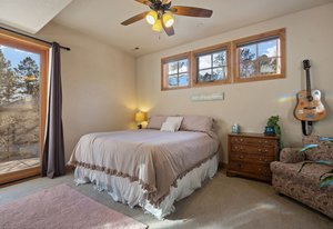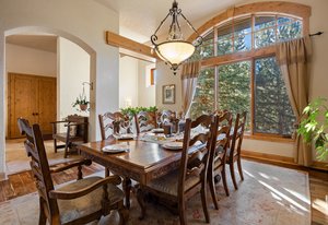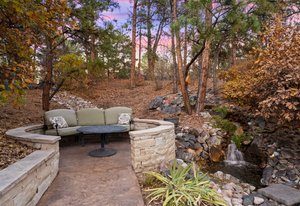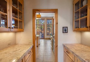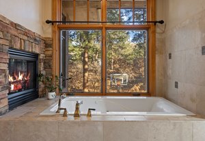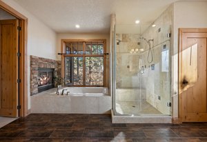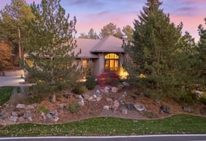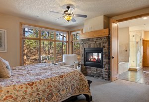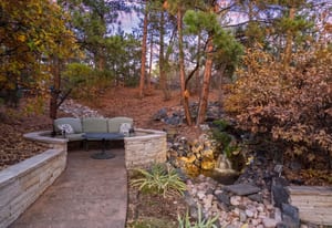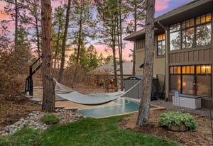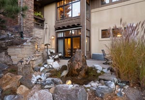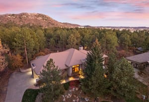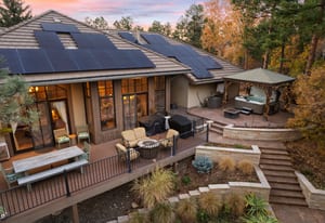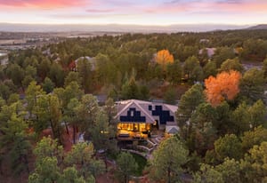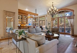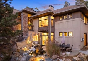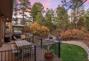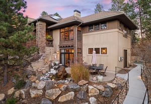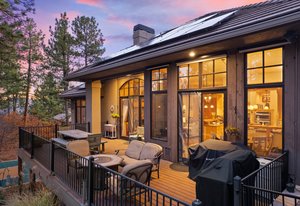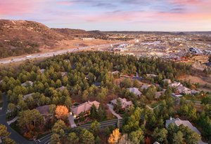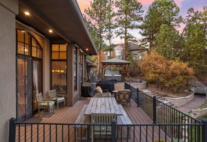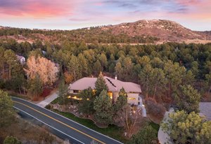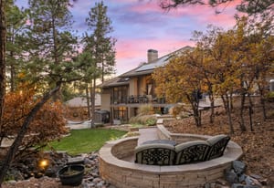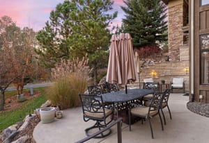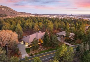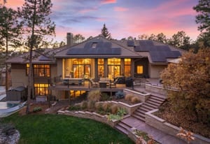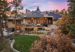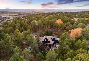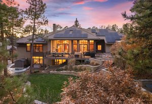 Surrounded by mature pines in the coveted Village at Castle Pines, this mountain-modern home blends warm Santa Fe influences with bright, contemporary design. A dramatic great room welcomes you with soaring ceilings, a stacked-stone gas fireplace, and a full wall of windows framing peaceful forest views. Sliding doors open to an expansive back deck, creating effortless indoor-outdoor living. The spacious kitchen features rich knotty alder cabinetry and trim, a five-burner Bosch gas cooktop, paneled refrigerator, wine fridge, prep sink, and a functional peninsula that leads to a well-appointed butler’s pantry and the formal dining room. Large windows throughout the main level fill each space with natural light. The main-floor primary suite offers tranquil backyard views, a double-sided fireplace, jetted tub, glass-enclosed shower, dual vanities, and a generous walk-in closet. A main-floor office showcases beautiful knotty alder paneling and oversized windows overlooking the front yard. A powder room, laundry room, and mudroom off the garage complete this level. The walkout lower level impresses with high ceilings and an expansive rec/family room featuring a stone fireplace and a convenient wet/coffee bar. Three secondary bedrooms each include large windows and en-suite baths. One suite provides direct access to the backyard through sliding doors along a gently sloped walkway—an appealing feature for enhanced accessibility. A separate playroom/flex room and a dedicated theater room offer outstanding versatility for recreation or work. Outdoor living spaces are a standout, with multiple tiered patios and decks designed for entertaining or quiet relaxation. Enjoy a basketball hoop, forested surroundings, and a charming water feature near the front patio. Beautifully designed and highly functional, this home captures the essence of Colorado living in a premier gated community with world-class amenities.