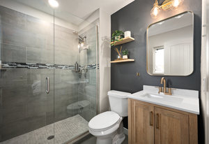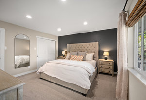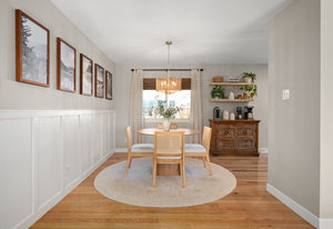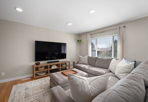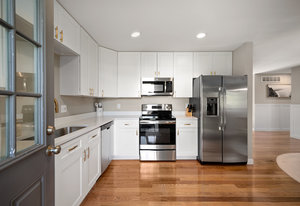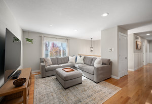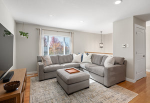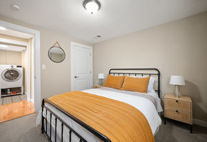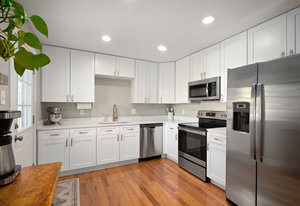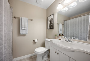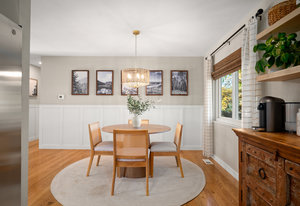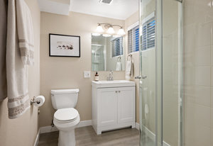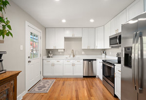 The main level offers a spacious living room perfect for relaxing or entertaining, flowing seamlessly into the updated kitchen complete with white cabinetry, quartz countertops, stainless steel appliances, and an adjoining dining area. Down the hall, a tastefully updated full bathroom serves two bedrooms and guests. The private primary suite is tucked away at the end of the hall, offering serenity with its own stylishly renovated ¾ bath.