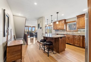 Inside, the open main level welcomes you with vaulted ceilings, a cozy wood-burning fireplace, and expansive windows framing beautiful mountain views. The spacious kitchen features granite countertops, stainless steel appliances, bar seating, and an adjacent dining area perfect for entertaining. A powder bath and bonus room with a private deck complete the main level.