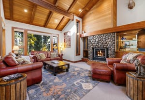 Enter the property’s foyer and discover an expansive light and bright split-level floor plan, with awe-inspiring ceilings in the main living area nestled amongst the towering pines, fluttering aspens and Lake views beyond. One bedroom with loft sits on the main living level alongside a full bath, with three additional bedrooms including the Owner’s Suite at ground level. This residence enjoys a private deck with one of the only exterior hot tubs in Chambers Landing—an incredibly rare and highly valued feature.