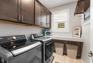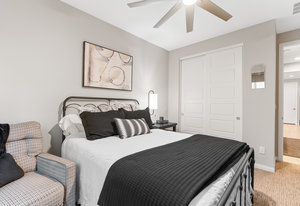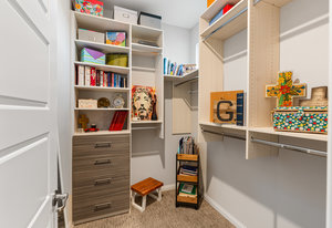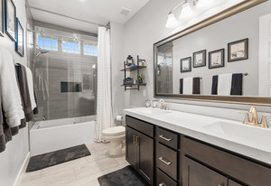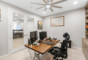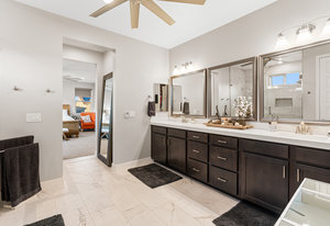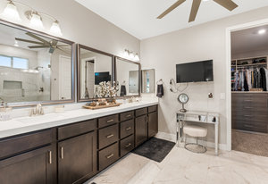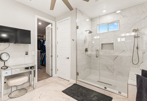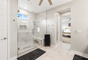 All three bathrooms have been remodeled. The primary suite features a spa-style bath with expanded shower, soaking tub, heated floors, and built-in under-sink outlets. Custom primary closet built-ins with dresser included.