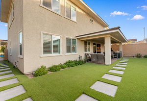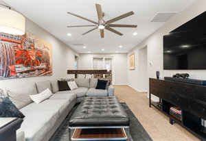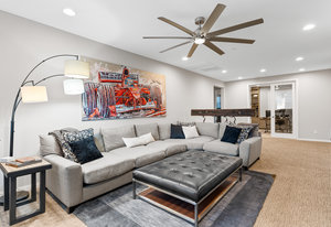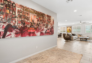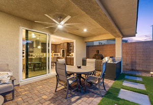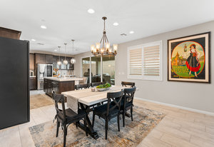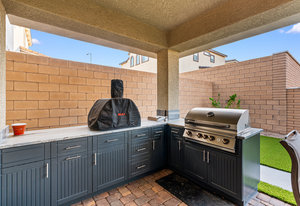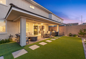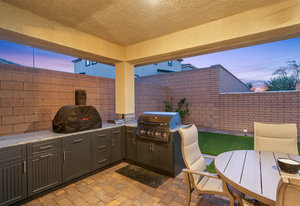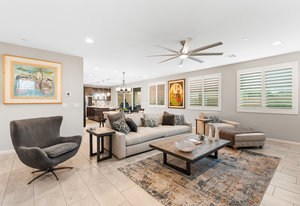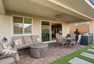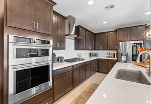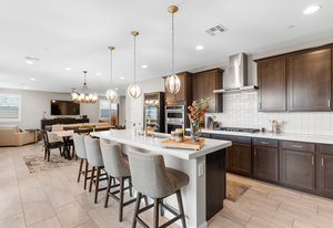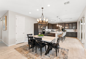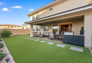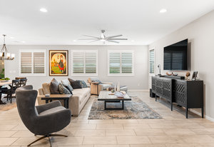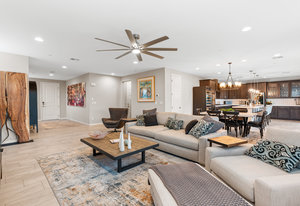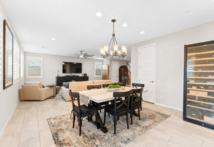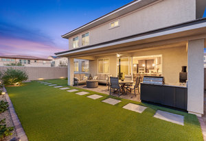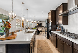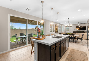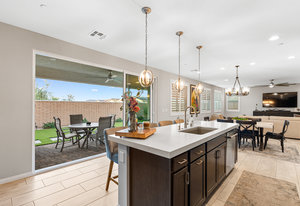 The open great room features dual multi-slide glass doors for seamless indoor-outdoor living. Chef’s kitchen includes custom cabinetry, quartz countertops, stainless steel appliances, and a large island.