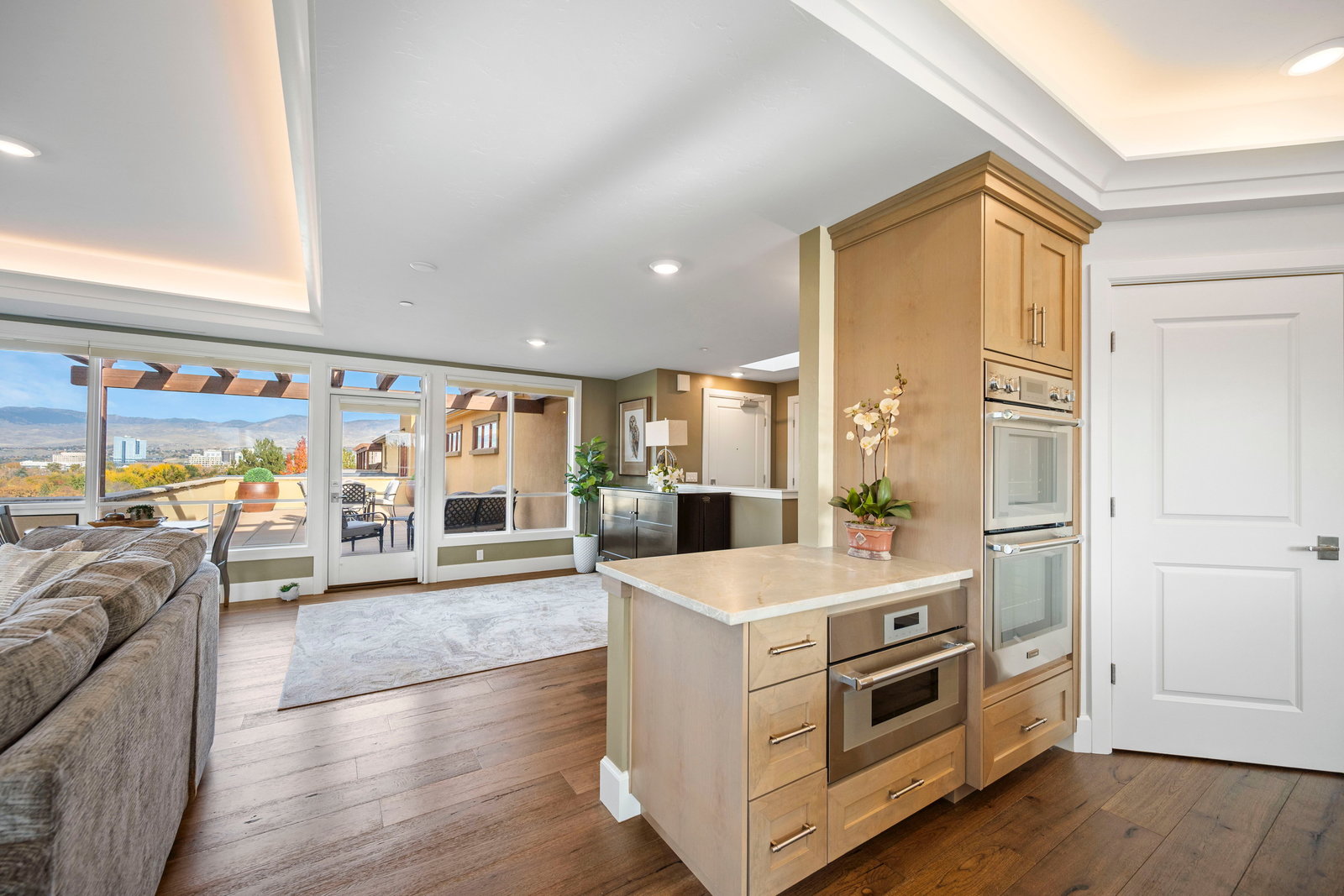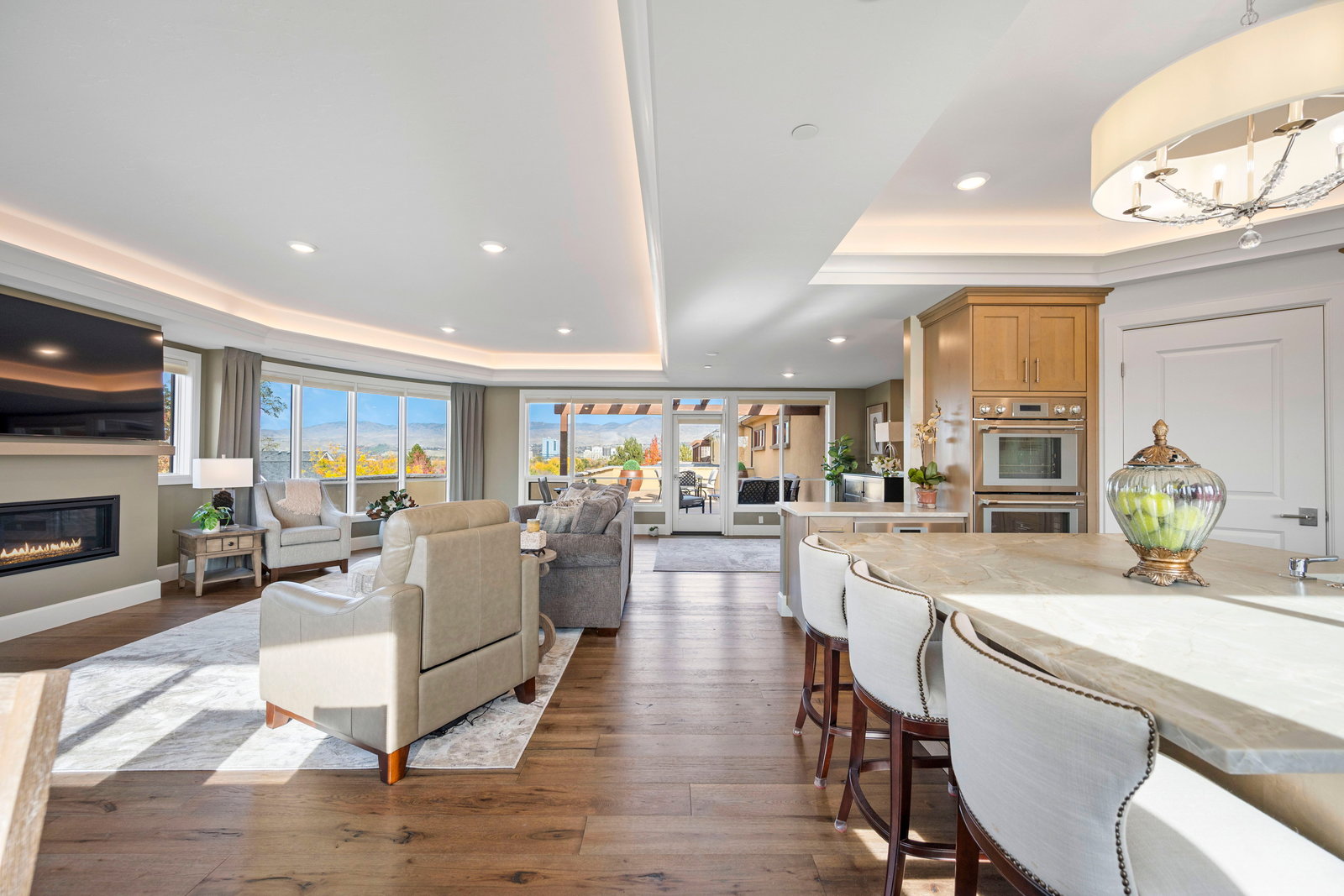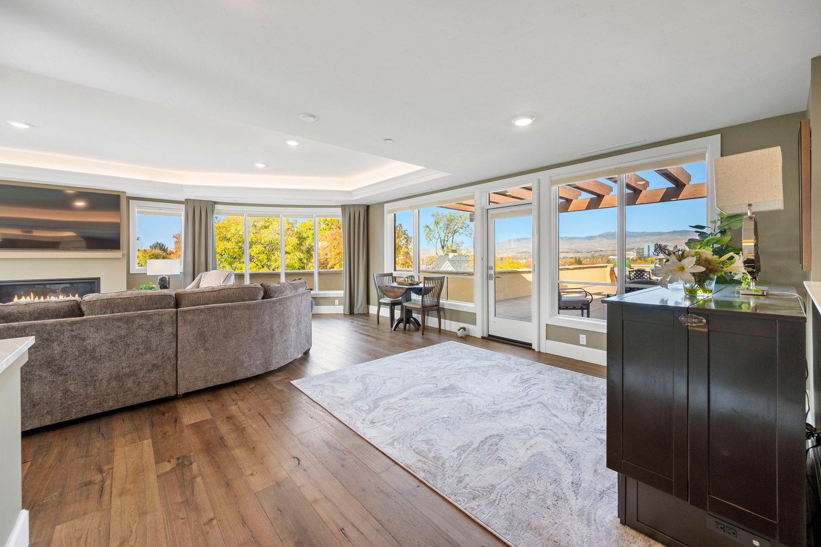 This exclusive top-floor residence offers breathtaking panoramic views of downtown Boise, and Ann Morrison Park which hosts the annual 4th of July fireworks and Labor Day hot air balloon launch—framed by expansive floor-to-ceiling windows that flood the space with natural light and showcase the evolving city skyline and snow-capped mountains.