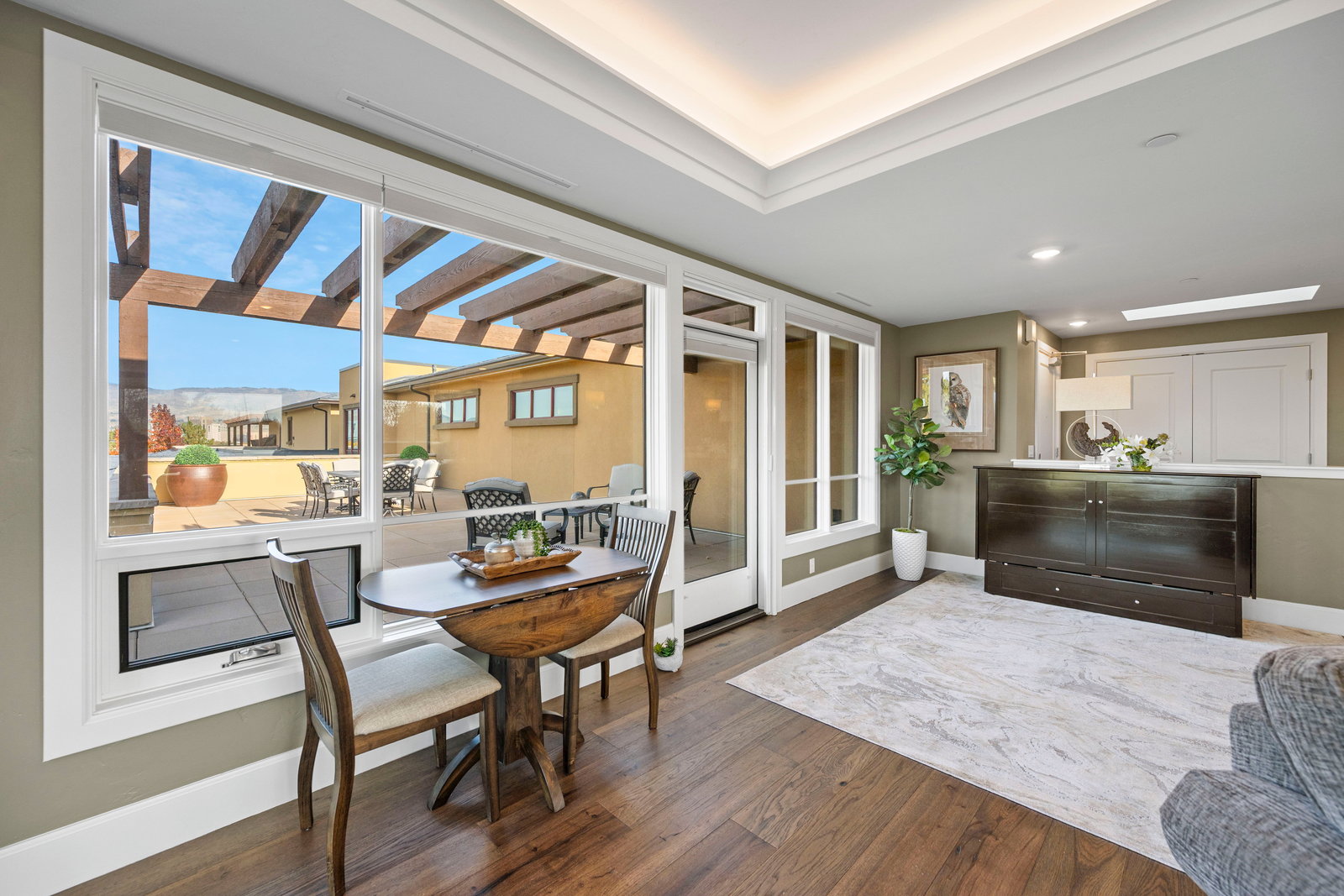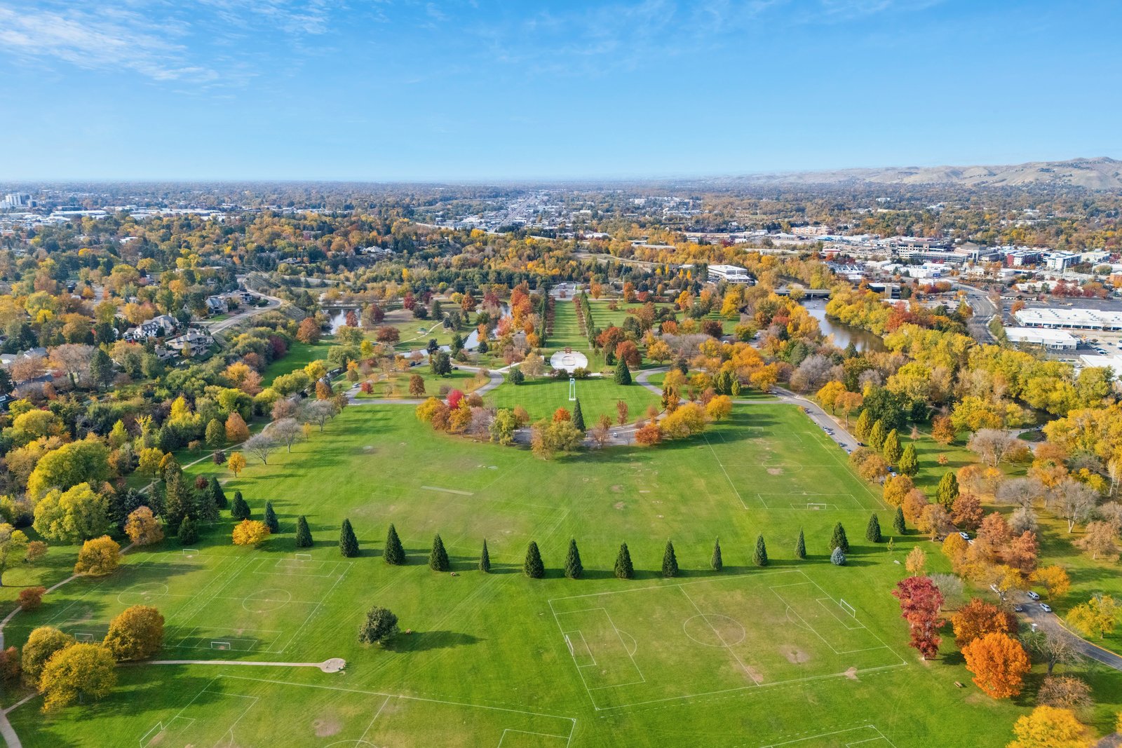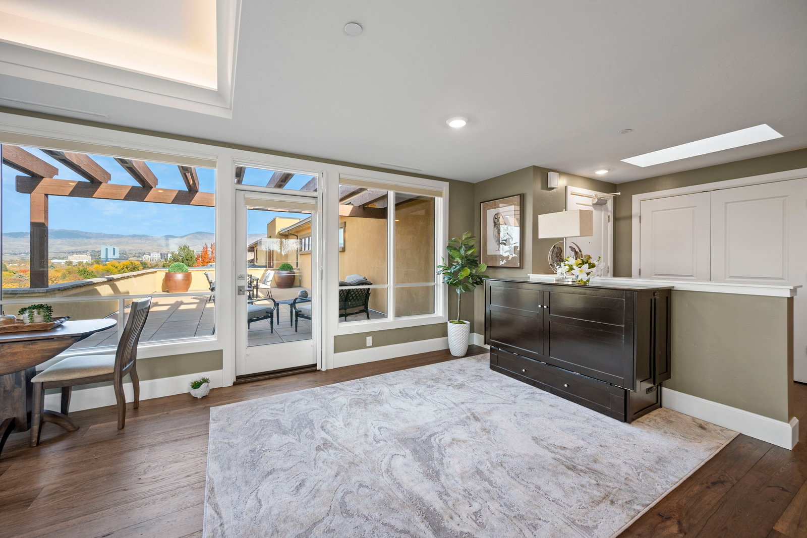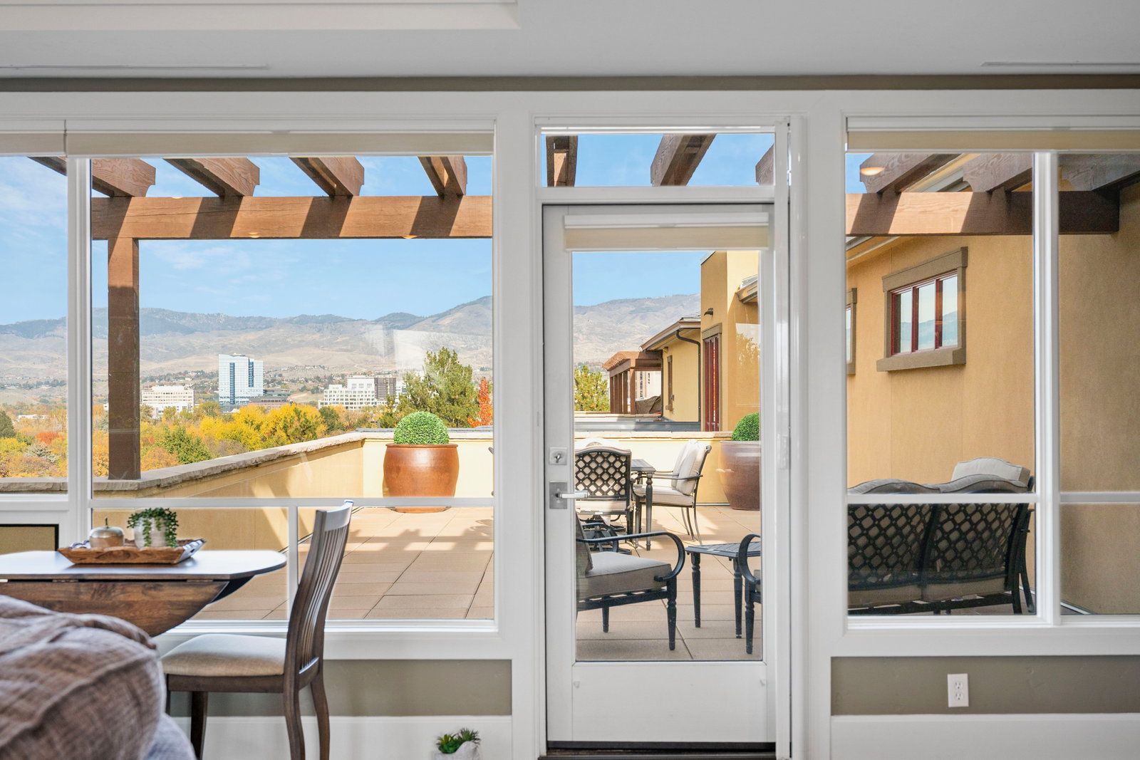 This exclusive top-floor residence offers breathtaking panoramic views of downtown Boise, and Ann Morrison Park which hosts the annual 4th of July fireworks and Labor Day hot air balloon launch—framed by expansive floor-to-ceiling windows that flood the space with natural light and showcase the evolving city skyline and snow-capped mountains.