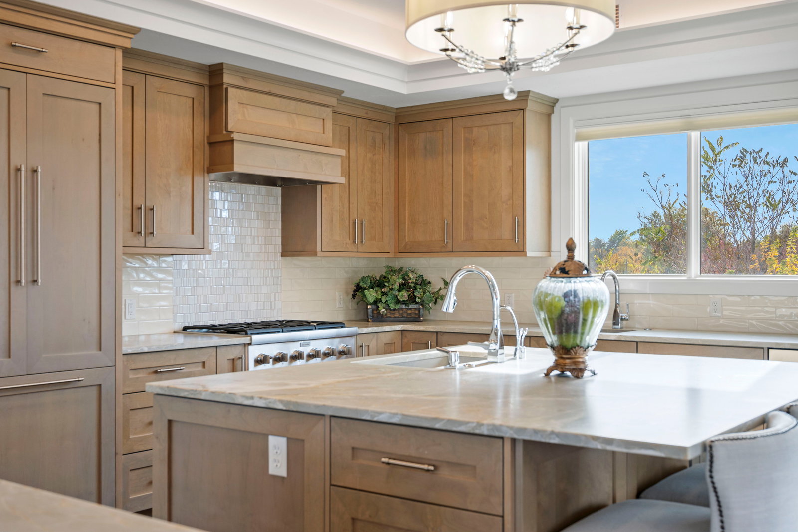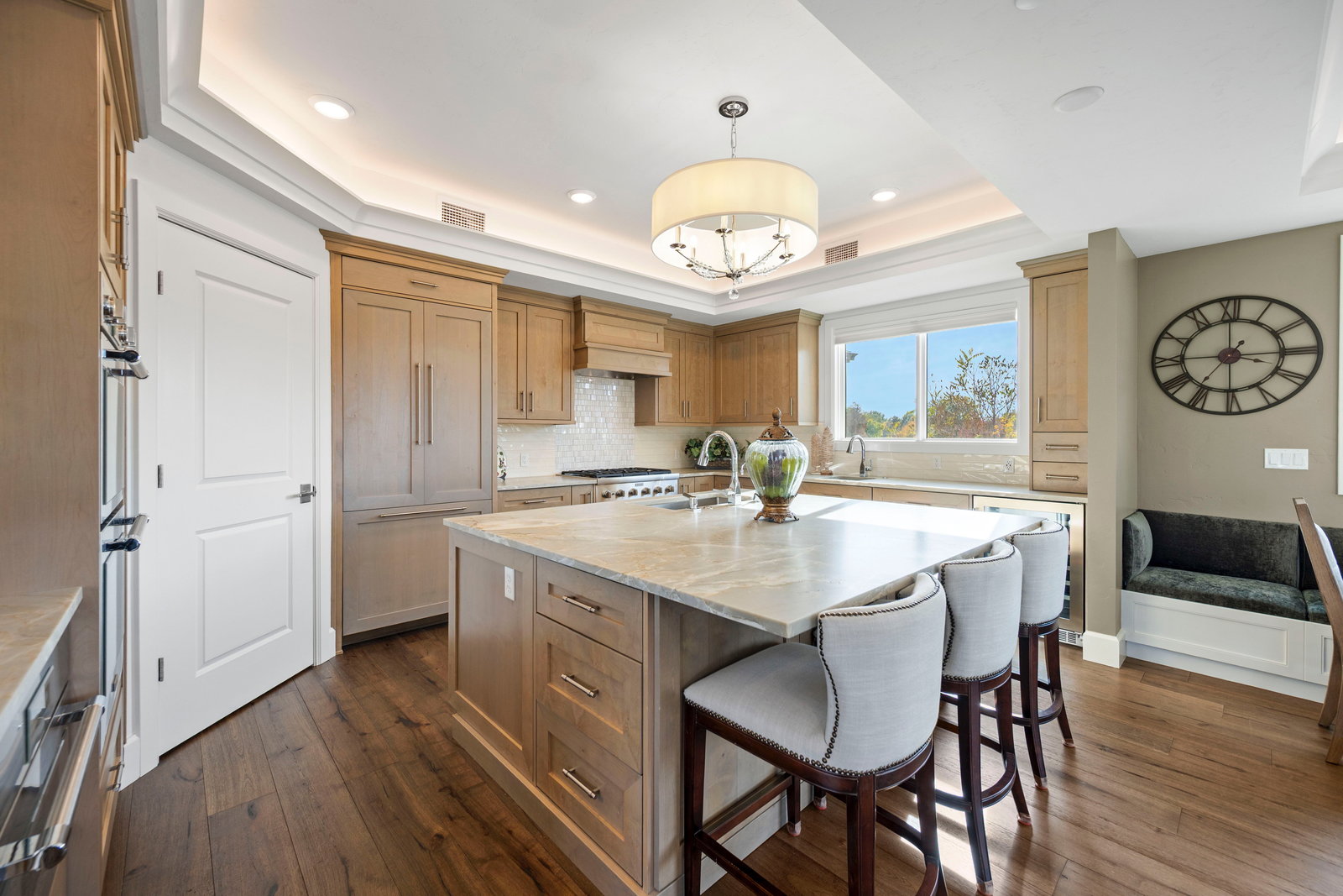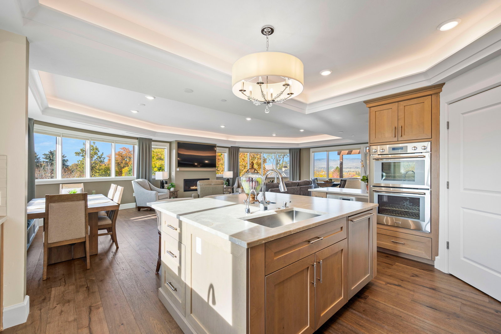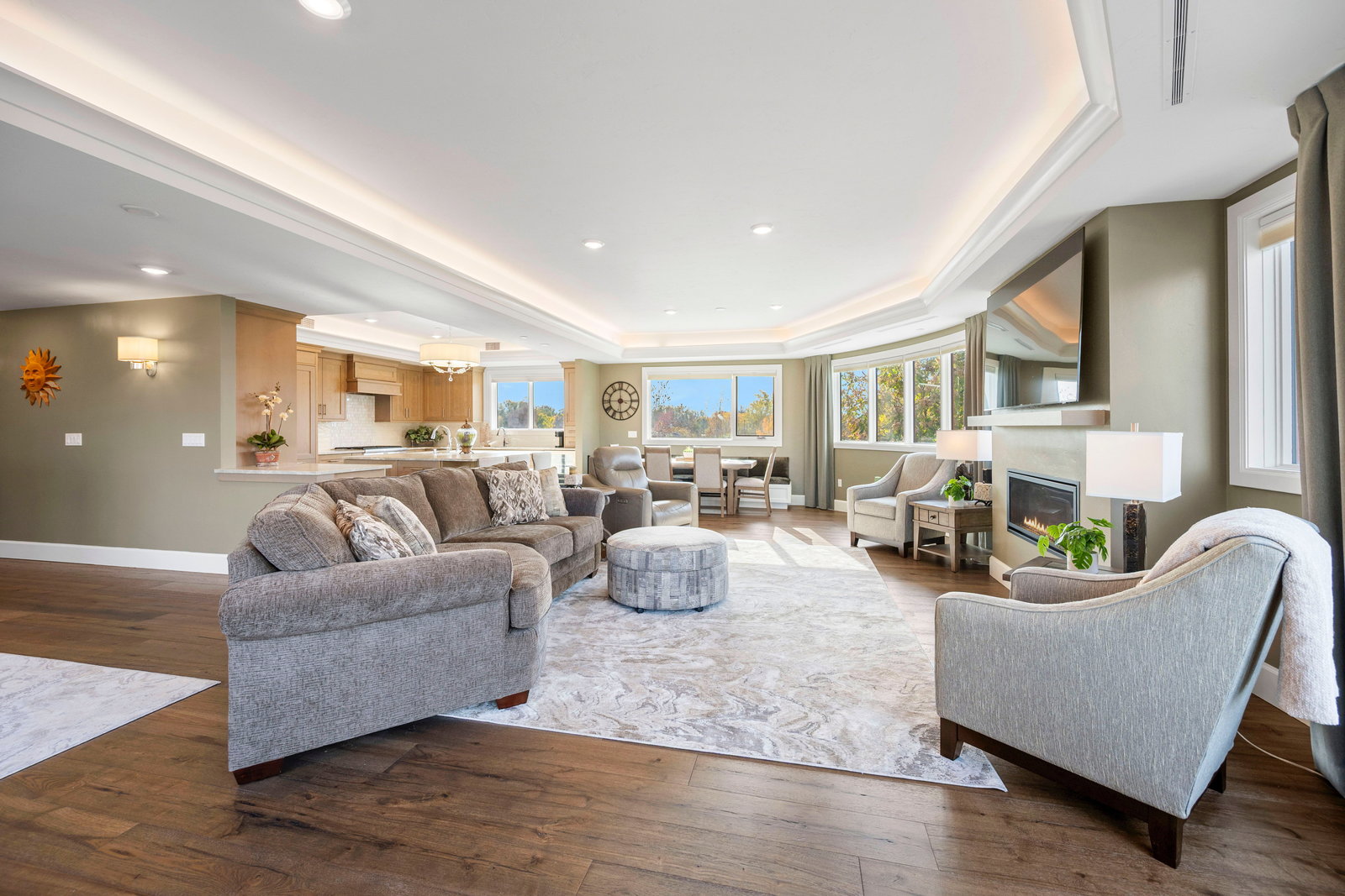 Inside, the chef-inspired kitchen is a masterpiece of design and functionality, featuring premium Thermador appliances, corner pantry, custom cabinetry, wine fridge and a generous island that flows seamlessly into the open dining and living areas. A refined fireplace anchors the space, perfect for cozy evenings and elegant entertaining.