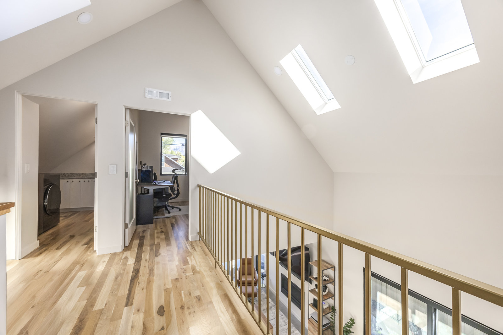 Inside, natural light pours through architectural Pella windows and skylights, showcasing Domain's custom craftsmanship and sleek modern finishes. The 1,801-square-foot main home features three bedrooms and 2.5 baths, with the opportunity to create a fourth bedroom or second living room by enclosing the vaulted space above the kitchen. Ample storage is provided by a walk-in pantry, utility space, a true laundry room, and spacious built-ins.