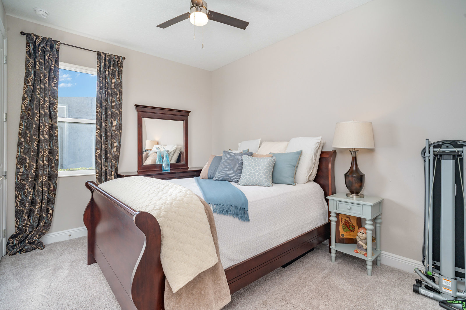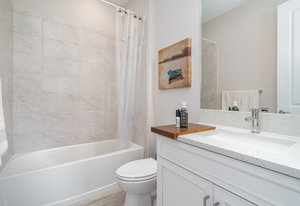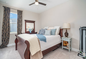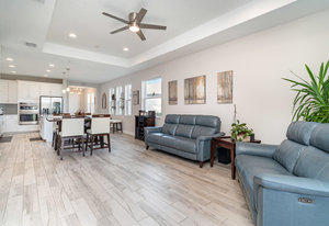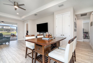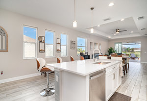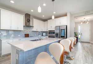 The chef’s kitchen is the heart of the home, beautifully designed with timeless white Shaker-style cabinetry, convenient pull-out drawers, and a soft blue subway tile backsplash that adds a refreshing coastal touch. A large center island with quartz countertops provides ample space for meal prep and casual dining, while pendant lighting creates a warm, inviting atmosphere. Stainless steel GE appliances, including a built-in double oven, sleek range hood, and French door refrigerator, enhance both the functionality and style of the space. The kitchen’s open layout flows seamlessly into the great room, where a tray ceiling and large windows fill the home with natural light, creating the perfect space for both entertaining and everyday living.