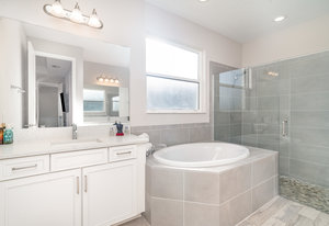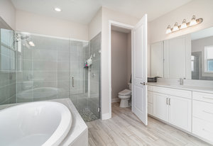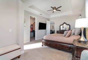 The primary suite is a true retreat, complete with a cozy sitting area, tray ceiling, walk-in closet, and a spa-inspired bathroom featuring dual ...