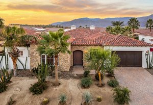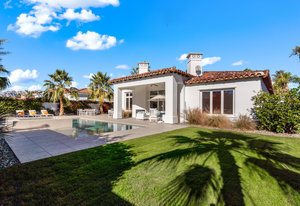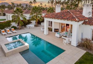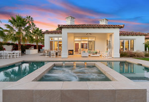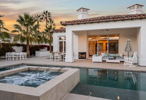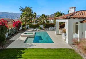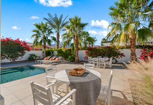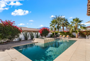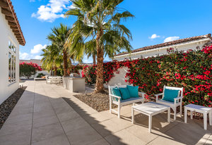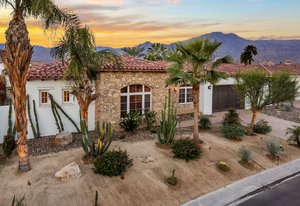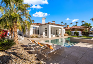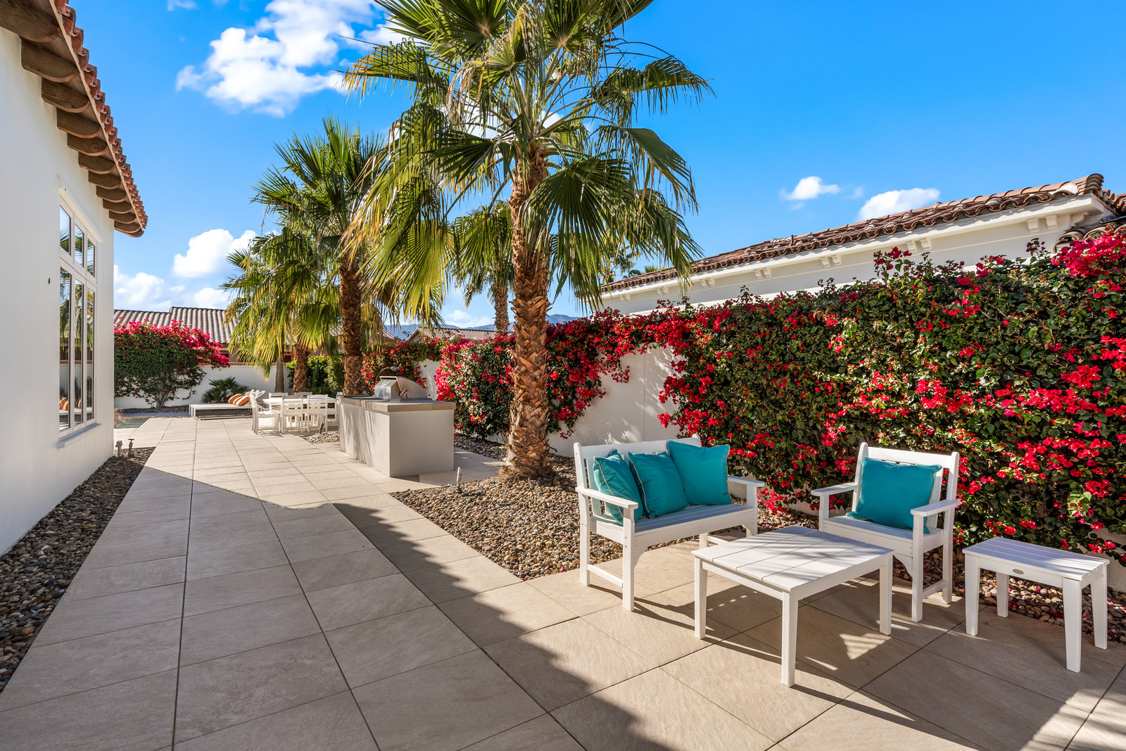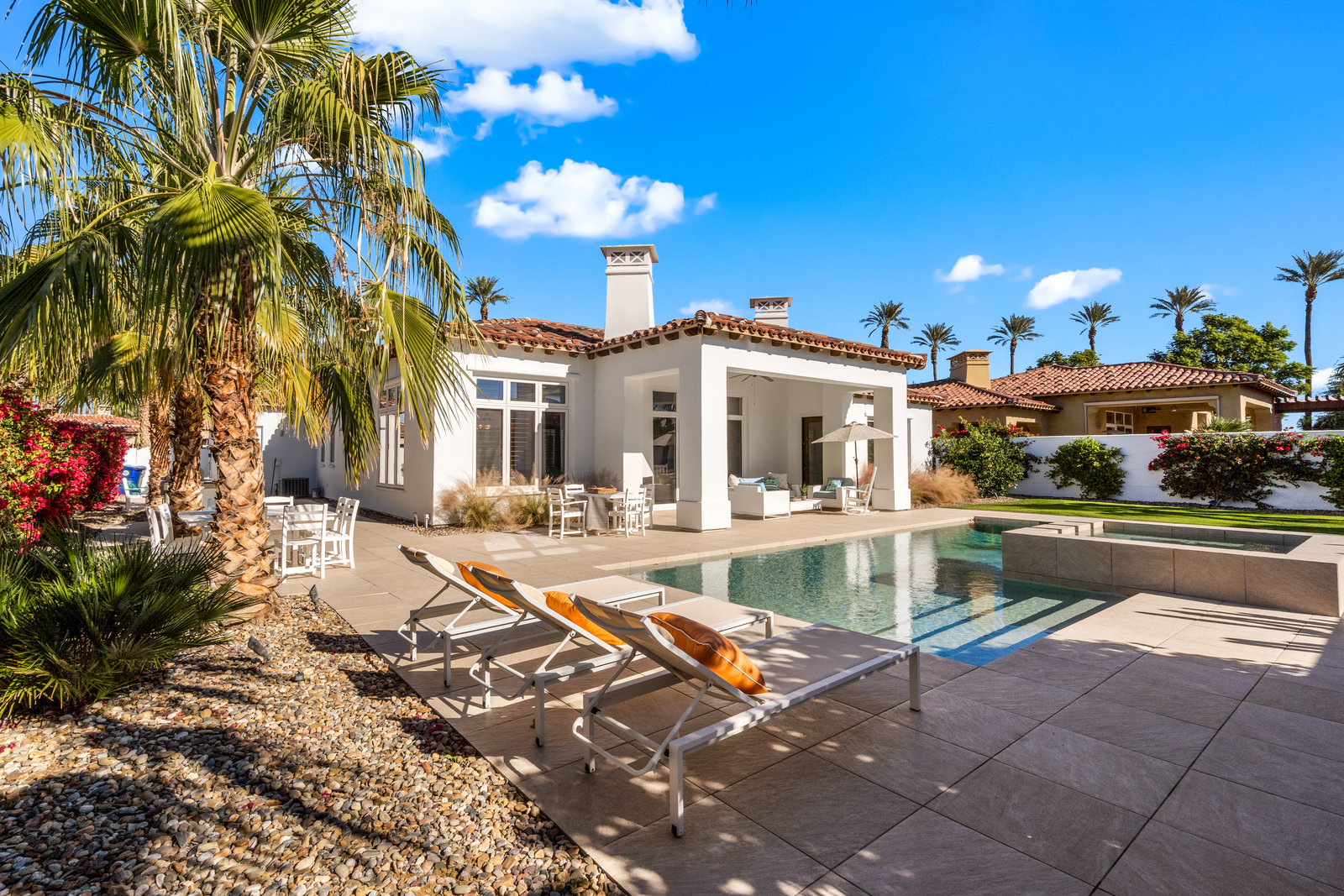 Stunning south-facing residence with 3 bedrooms, plus a den, set within the coveted Palms Golf Club, where timeless desert living meets mountain panoramas. Thoughtfully designed and meticulously maintained, this custom home captures the essence of resort living with a sparkling pool and spa, expansive decking, and a built-in BBQ perfect for gathering with friends and family. A courtyard entry welcomes guests with warmth and privacy, offering direct access to a detached casita. Through double doors, the interiors unfold with impressive scale, featuring vaulted ceilings, travertine flooring throughout, custom shutters, and an open-concept layout that balances refined comfort with an easy indoor-outdoor flow. The great room, anchored by a fireplace and framed by picture windows, connects seamlessly to the dining area and gourmet kitchen, where stainless steel appliances, a beverage cooler, upgraded cabinetry, and a generous breakfast bar create a space that is both functional and inviting, perfect for everyday living or entertaining with ease. The primary suite is a serene sanctuary, with spa-inspired bath features, including dual vanities, a soaking tub, and walk-in shower, enhancing the home’s retreat-like atmosphere. The Palms Golf Course, designed by Master’s Champion Fred Couples and located within the community, is a place where golf’s traditions are cherished, and the lifestyle is lived daily. In addition to world-class golf, this home is ideally positioned within minutes of premier dining, boutique shopping, renowned tennis and pickleball venues, and the Coachella Valley’s celebrated festivals, offering effortless access to the very best of desert living.