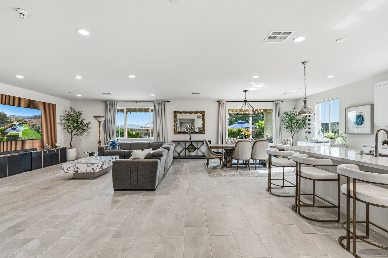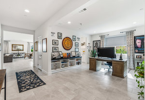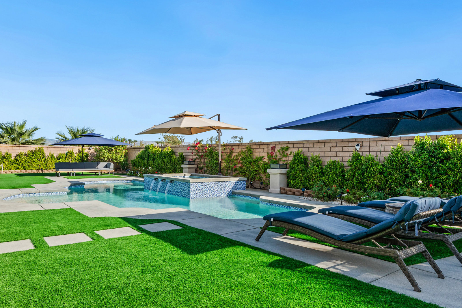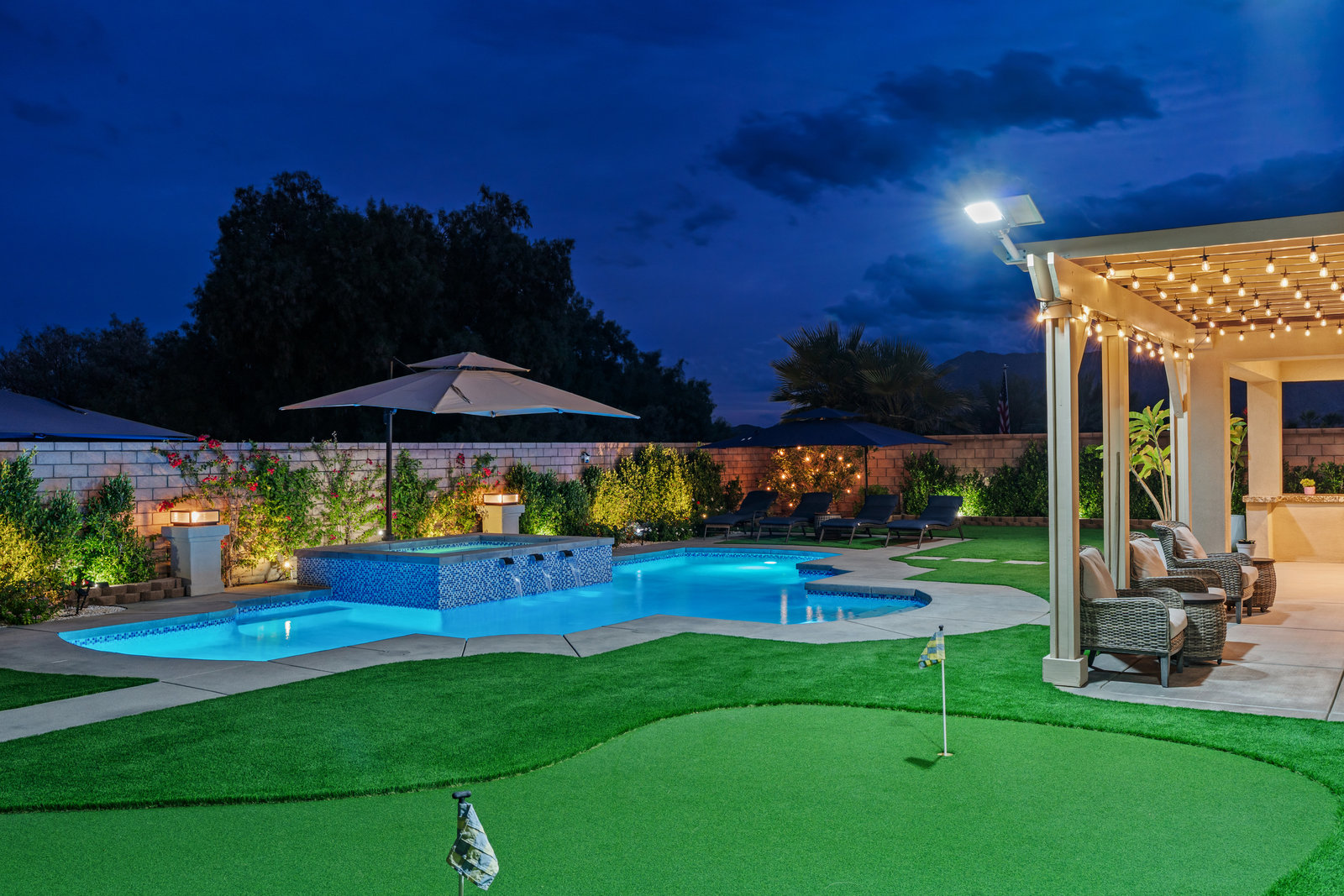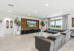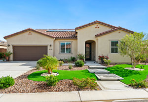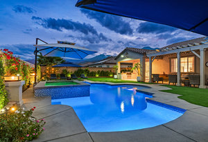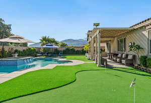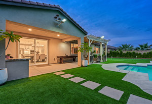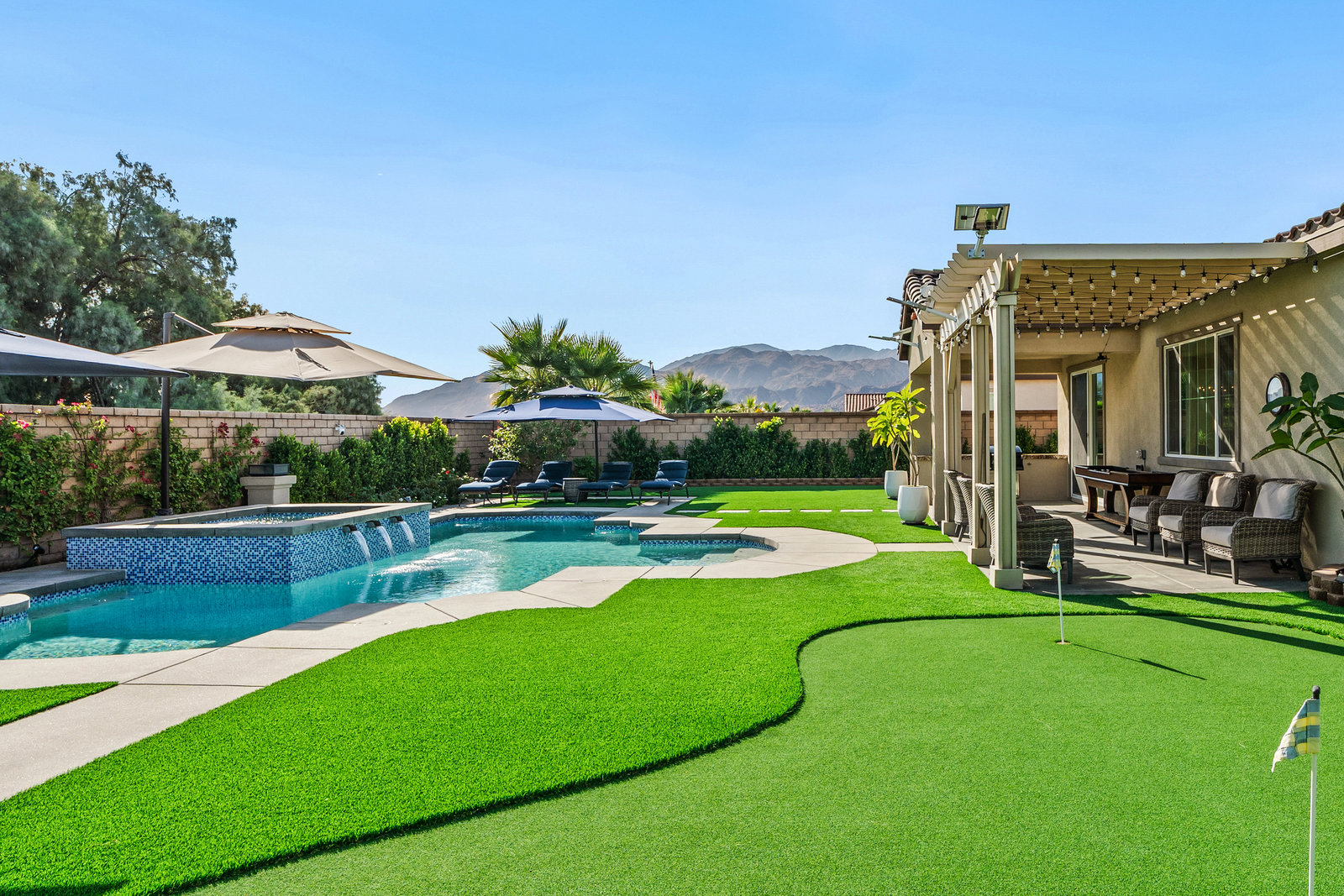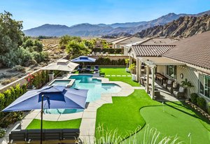 Welcome to 58228 Aragon Way, a light filled La Quinta retreat offering privacy, space, and thoughtful upgrades throughout. Located in the desirable Cantera at Coral Mountain community, this 3-bedroom plus den, 3-bath residence spans approximately. 3,006 sq. ft. on an expansive 11,761 sq. ft. lot with beautiful mountain views from the front, both side yards, and the backyard. Designed for bright year-round ambiance, the home enjoys excellent sun orientation and natural light. Each bedroom offers its own en-suite bath, while the flexible den can serve as an office or formal dining room and includes custom built-in cabinetry. Modern conveniences include owned solar (6.3 kW), three HVAC zones, tankless water heater, soft-close cabinetry, upgraded hardware, dimmer lighting, quartz center-island counters, and built-ins in both the office and family room. The backyard is an entertainer’s haven featuring a custom saltwater pool and oversized spa, adjustable LED pool and spa lighting, artificial turf, and a 4-hole putting green. The patio receives early shade in the summer, while the winter sun gently warms the south-facing windows, creating comfortable indoor living across the seasons. Indiana Laurel hedges line three perimeter walls, offering exceptional privacy while preserving open-sky views, with no construction planned behind the property. Additional features include a 3-car garage with built-in workbenches and shelving, four exterior cameras, fruit trees, solar landscape lighting, low maintenance landscaping, and low utilities per seller. A rare opportunity offering generous lot size, meaningful separation from neighbors, and a beautifully upgraded setting ideal for full-time living or a desert escape. Ideally located near renowned golf courses, top-tier tennis venues, and the vibrant dining and lifestyle destinations that define La Quinta living.