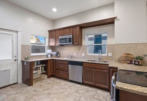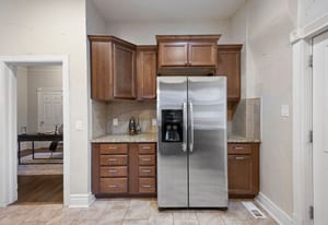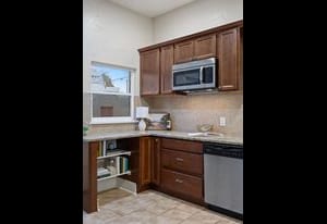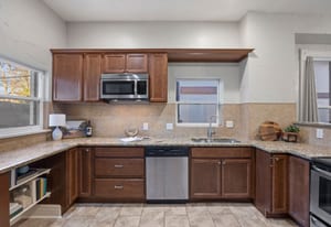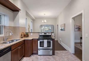 The main level features a spacious living and dining area, perfect for everyday living and entertaining. The kitchen blends classic warmth with traditional updates, including ample counter space, tile backsplash, stainless steel appliances, and rich wood cabinetry.