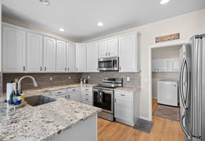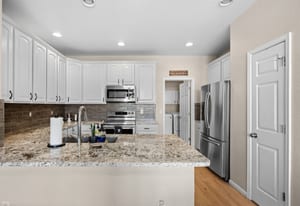 The gorgeously updated kitchen features rich upgraded cabinetry with crown molding, stunning granite slab countertops, and thoughtful finishes throughout. Enjoy seamless indoor-outdoor flow with a spacious front porch and private patio, ideal for morning coffee or evening relaxation.