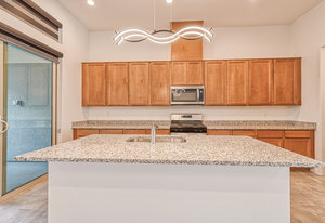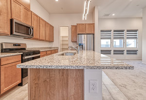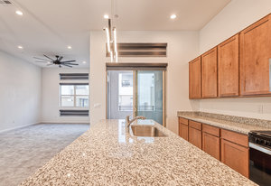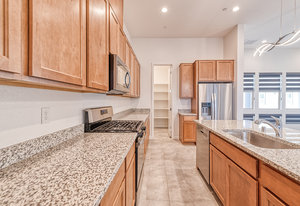 natural light, high ceilings & a sleek kitchen featuring an oversized island, stainless appliances & a walk-in