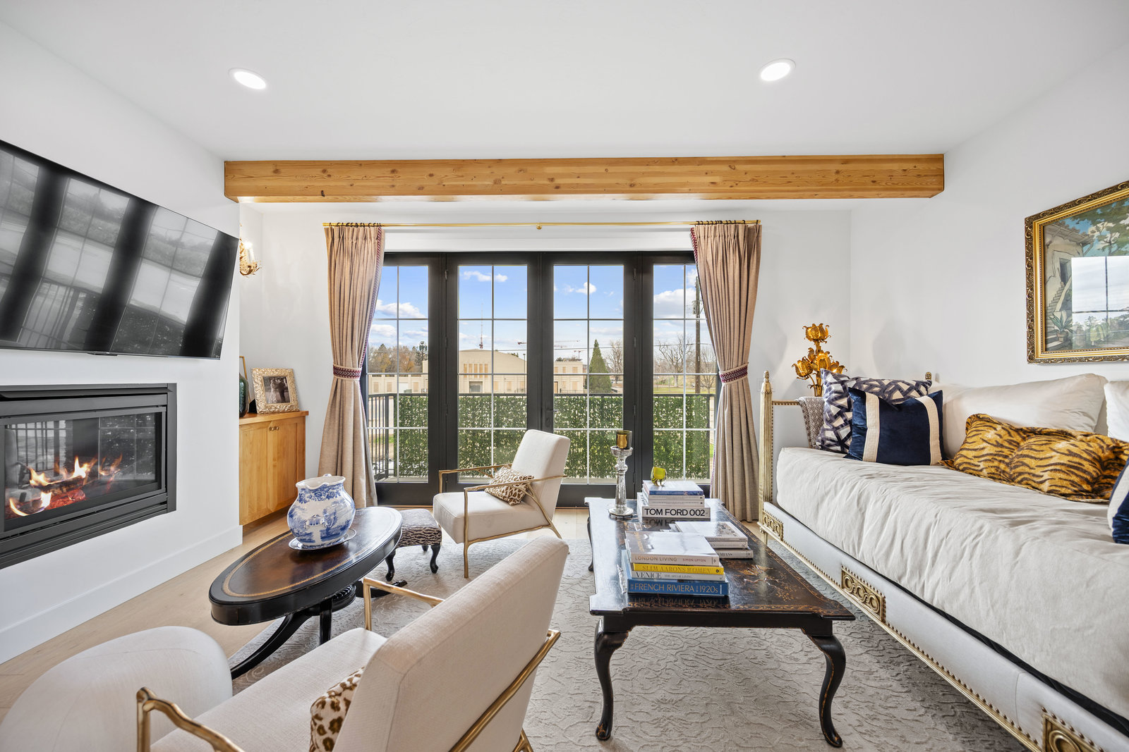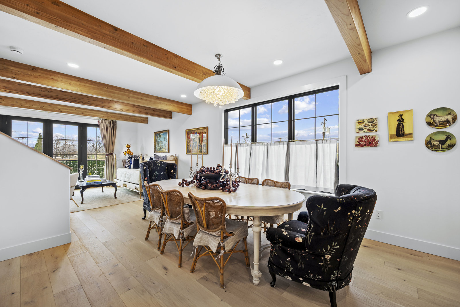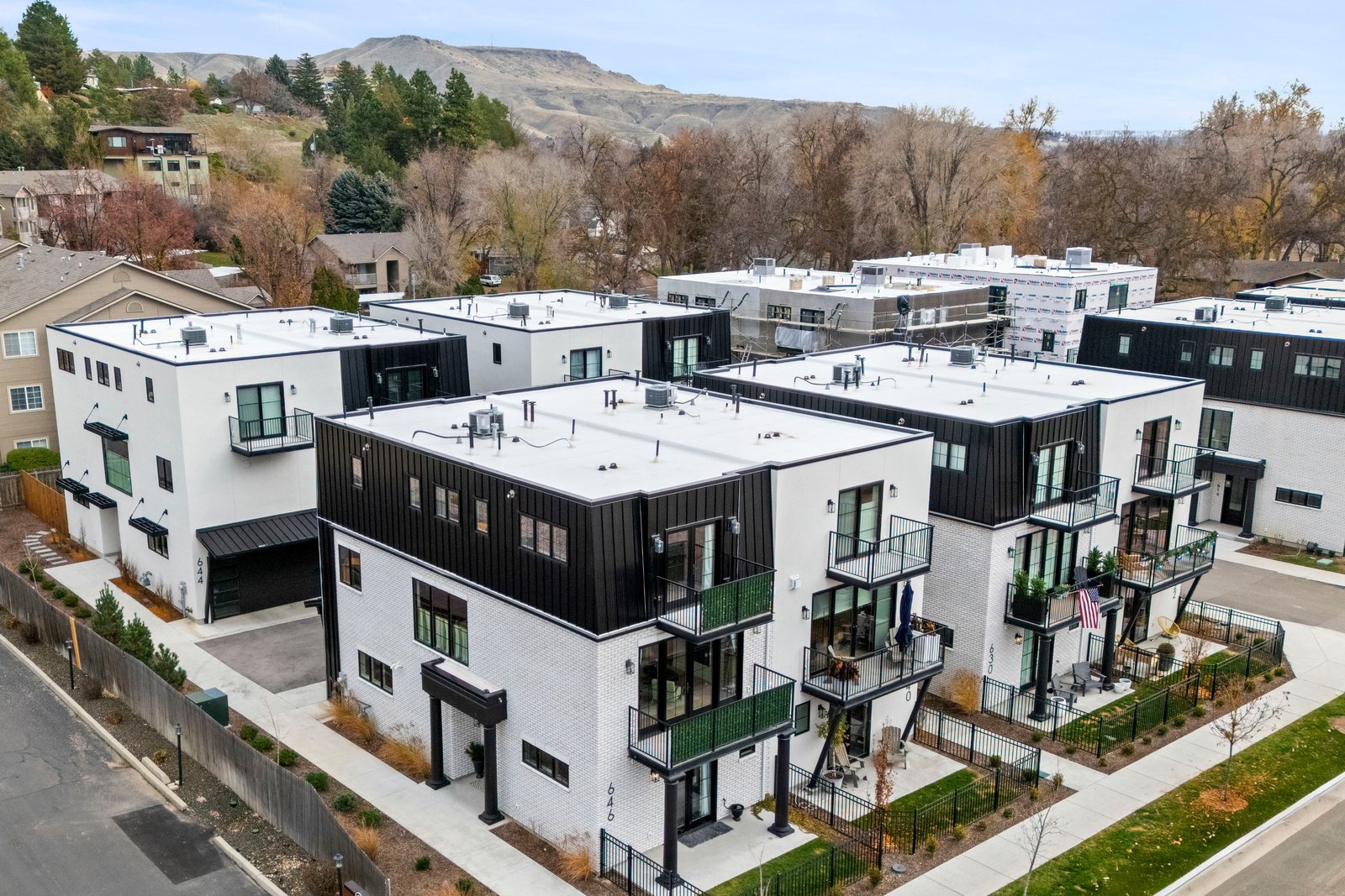 European-Inspired Luxury Living with views of Foothills East Reserve. Six Four Six is the premier residence in the community, curated with bespoke European finishes and perfectly positioned to overlook Boise’s Military Reserve. Sun-filled living spaces showcase wide-plank raw oak floors, natural wood beams, a gas fireplace flanked by custom cabinetry and European vintage sconces. French doors lead to the balcony overlooking the reserve and picture perfect sunsets. The epicurean kitchen features a 6-burner Thermador range with hood, black granite slab surfaces and backsplash, stainless appliances and a butler’s pantry with wine fridge, coffee bar, and elegant French café curtains framing foothills views. Upstairs, the primary suite indulges with heated marble floors, dual closets, a modern soaking tub, gold fixtures, and a sculptural orb pendant in the private water closet. A second ensuite bedroom offers its own Romeo balcony and luxurious finishes. The garden suite features Chihuly inspired lighting, an ensuite bath and laundry for guests. French doors adorned with custom European draperies open to the quaint patio for ultimate relaxation. This is a one of a kind, turn key European Luxury Townhome and includes HOA-maintained landscaping and a community outdoor dining pavilion. Steps from foothills trails, St Lukes, Downtown Boise, BSU and the Greenbelt.