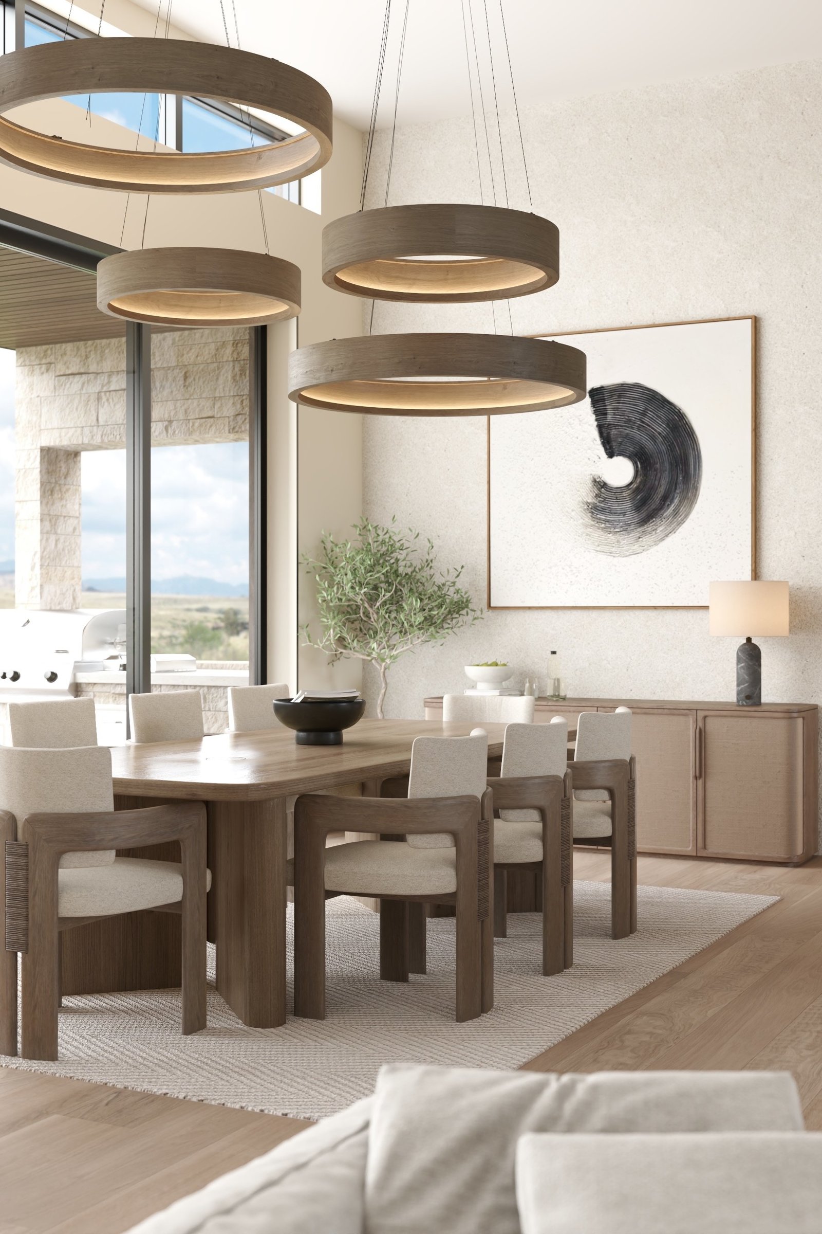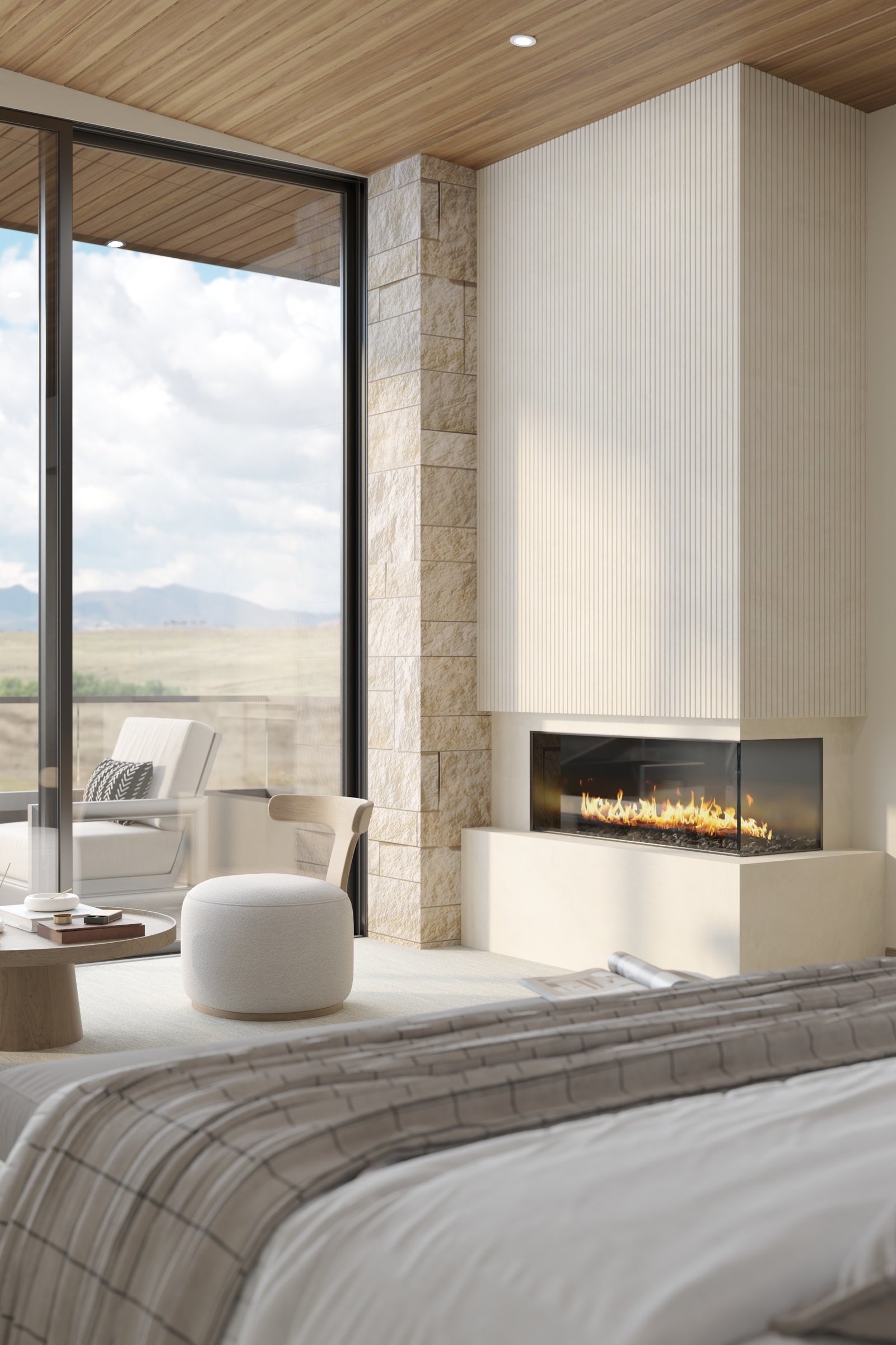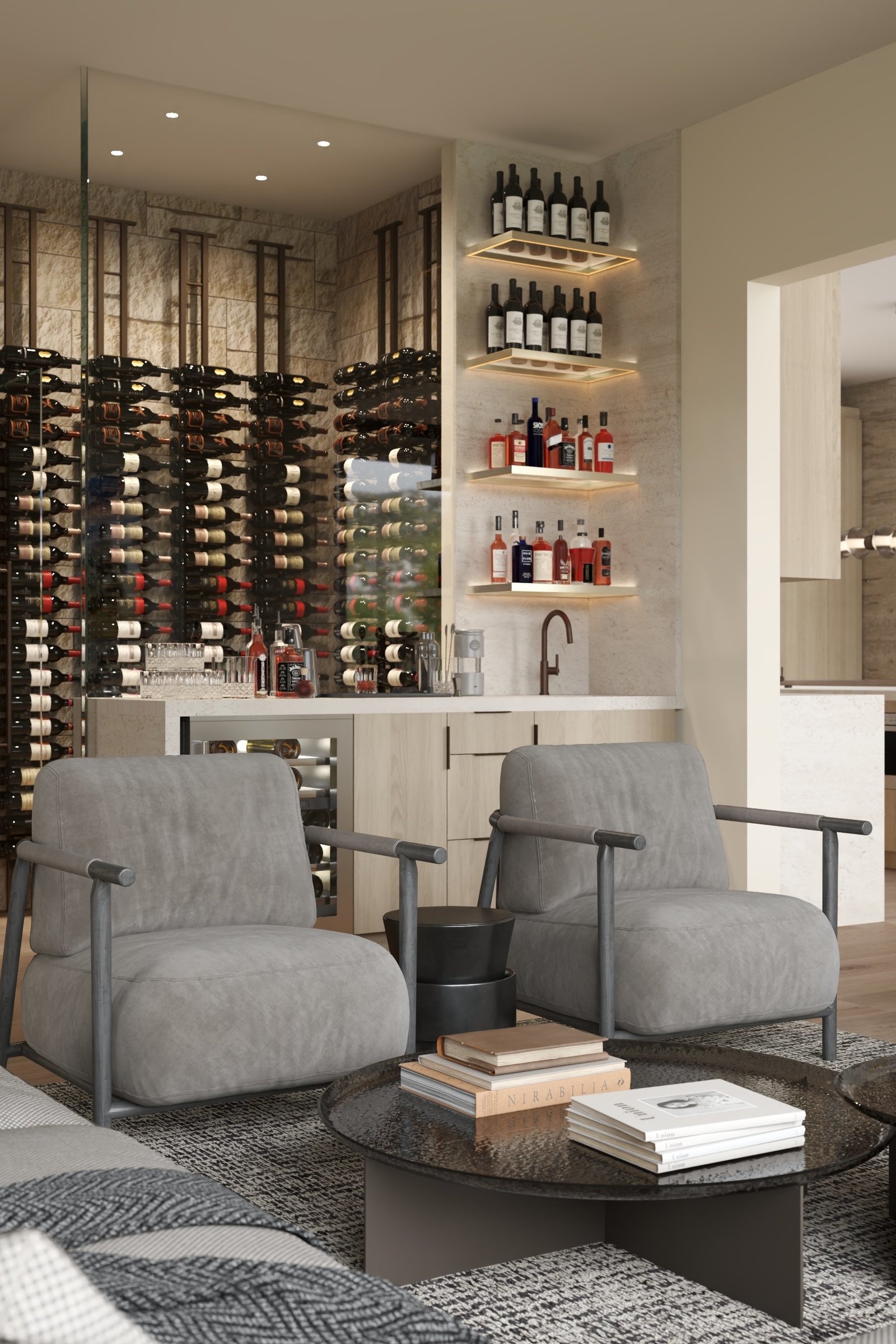 Spanning 8,430 square feet, the interior blends scale and warmth with seamless material transitions. Dekton Marmorio, quartzite, and white oak define the space, paired with Wolf and Sub-Zero appliances and walls of glass that frame snow-capped peaks. Wellness spaces include a gym, sauna, steam room, and hot tub for year-round enjoyment.
