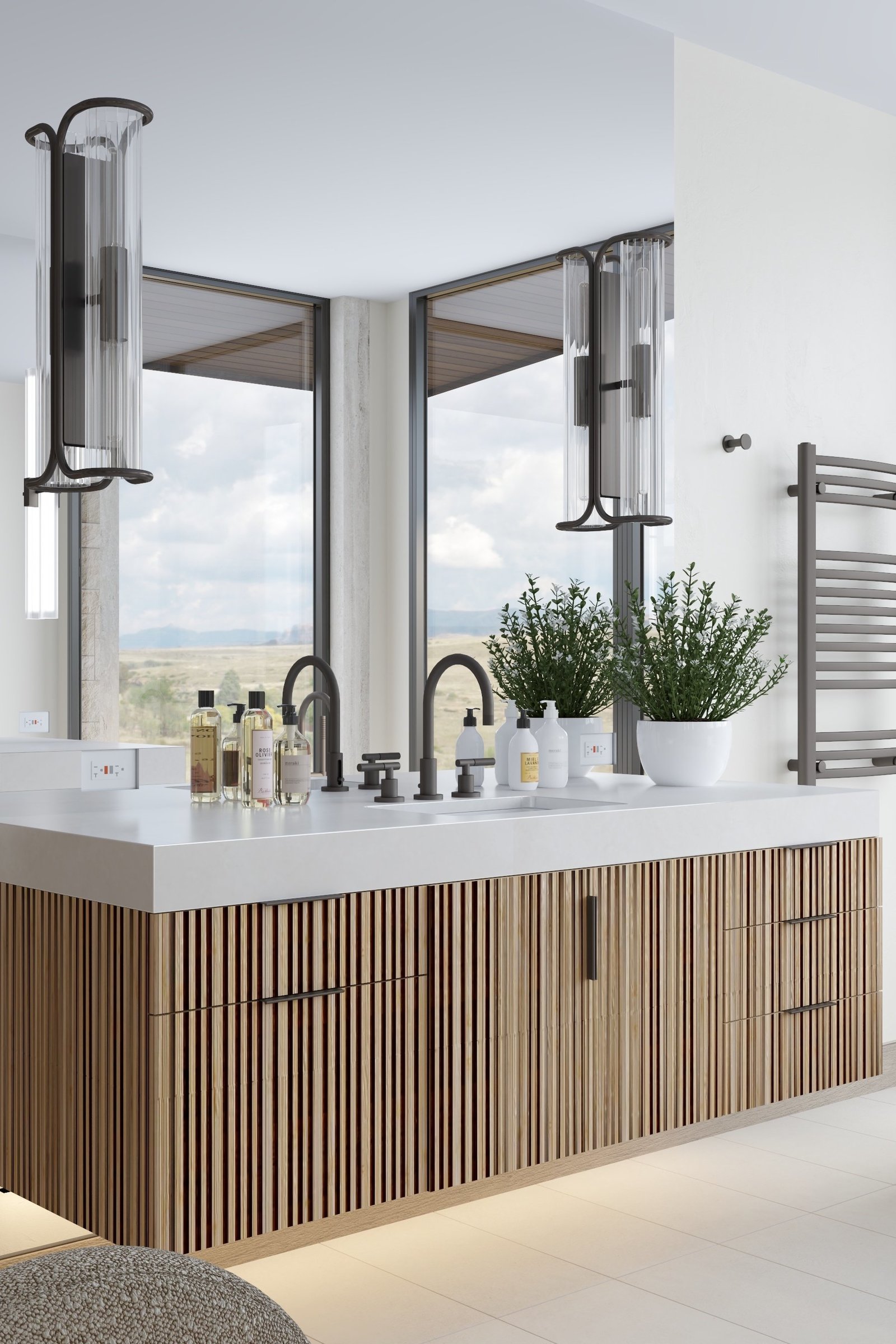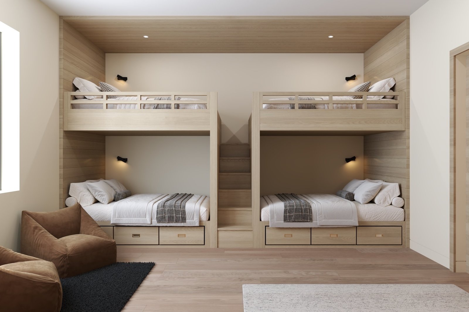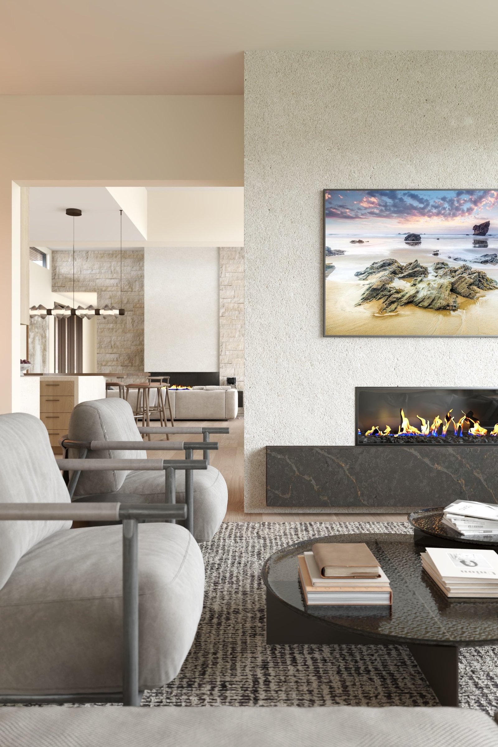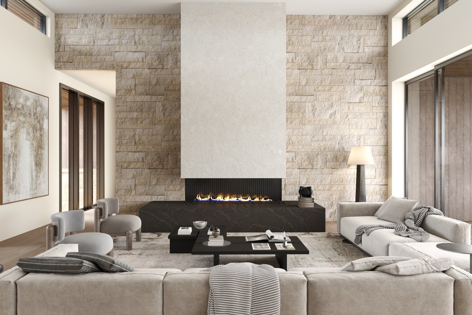 Spanning 8,430 square feet, the interior blends scale and warmth with seamless material transitions. Dekton Marmorio, quartzite, and white oak define the space, paired with Wolf and Sub-Zero appliances and walls of glass that frame snow-capped peaks. Wellness spaces include a gym, sauna, steam room, and hot tub for year-round enjoyment.