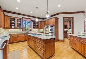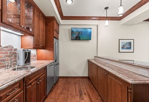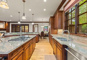 The chef’s gourmet kitchen is both beautifully appointed and highly functional, featuring Sub-Zero and KitchenAid appliances, high-end cabinetry, slab granite countertops, and two dishwashers—a rare and valuable feature for effortless entertaining. Two generous islands, first with prep sink and expansive cooking area and second with counter-height seating, an adjacent informal dining area, and a well-appointed butler’s pantry create a natural gathering space, while two patios just off the kitchen and breakfast area allow for easy indoor-outdoor dining.