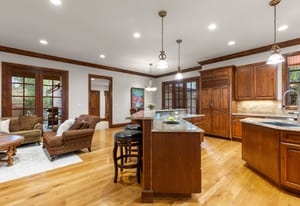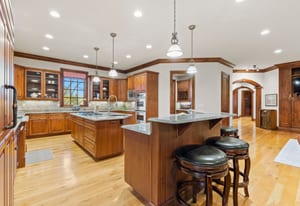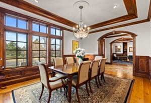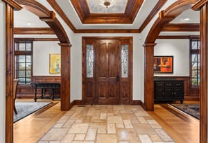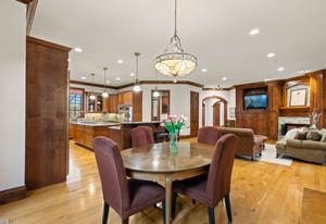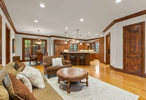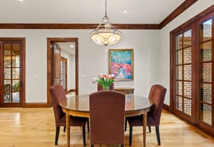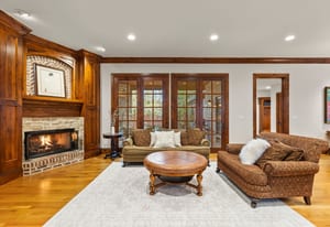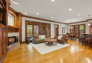 A striking Tudor exterior framed by mature trees and distinctive architectural detailing, creates an unforgettable first impression. Inside, the home blends enduring craftsmanship with well-designed living spaces, where natural light and quality construction are complemented by high-end finishes throughout. Grand main-level living spaces, including an expansive dining room and living room, provide an exceptional setting for entertaining. A warm and inviting gas fireplace anchors the formal living room area, while another grand stone fireplace anchors the family room. Doors from the family room open directly to the backyard, creating a seamless indoor-outdoor connection ideal for entertaining. Four fireplaces throughout the home add warmth and character across multiple living spaces.