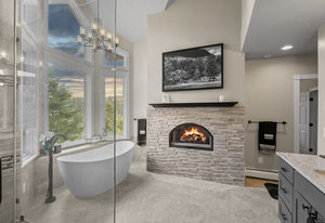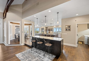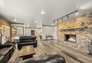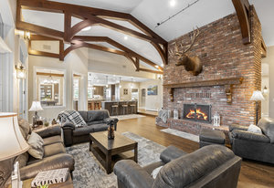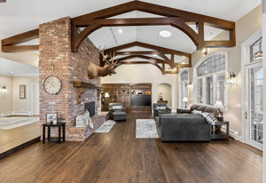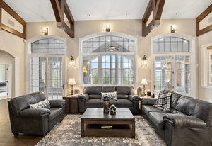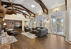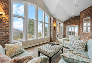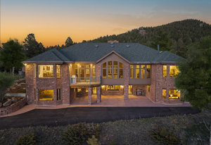 The 7,700± sq ft brick-built estate was designed for longevity and low maintenance in the Colorado climate, while expansive windows and vaulted interiors frame the surrounding beauty. A floor-to-ceiling brick fireplace anchors the great room, complemented by custom timber trusses, a glass-wrapped sunroom, and a gourmet kitchen with premium appliances and a large granite island. The primary suite is a retreat of its own, featuring a double-sided fireplace that opens to a spa-like ensuite with a freestanding tub and sweeping mountain views. The expansive lower level offers a stone fireplace, large family room, game area, bedrooms, and a theater room—ideal for multi-generational living or extended guests.