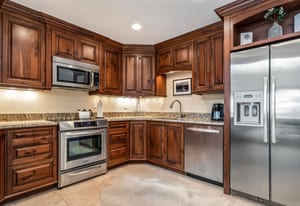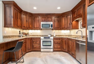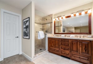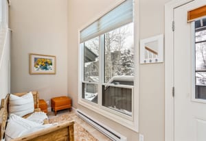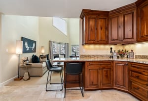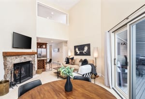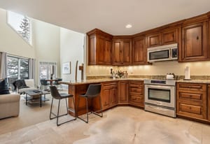 The kitchen and main living areas are designed for everyday use rather than presentation alone, with a generously sized kitchen for cooking and gathering, exceptionally high-end custom wood cabinetry, two bar seating areas for casual meals or entertaining overflow, and an easy flow into the dining and living spaces that keeps everyone connected without crowding. The dining table features an extension leaf that comfortably accommodates six when needed, and vaulted ceilings enhance the light and openness throughout. A full remodel completed approximately fifteen years ago reimagined the interior, focusing on quality, durability, and long-term relevance rather than trend-driven finishes. Executed at a high level, the complex and lightly used finishes remain highly relevant to today’s buyer, featuring natural materials and a warm, mountain-appropriate aesthetic that still reads current. Slab travertine, including the primary bathroom countertop, and European-style glass shower detailing anchor the bath finishes. In contrast, natural stone surfaces, such as slab granite, add durability and continuity to the kitchen. Thoughtful reconfiguration of the floor plan improved storage and day-to-day functionality, resulting in a home that feels cohesive, settled, and exceptionally well-maintained.
