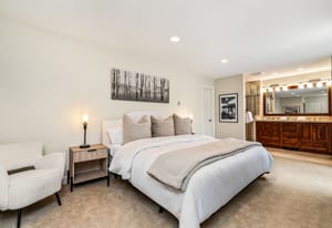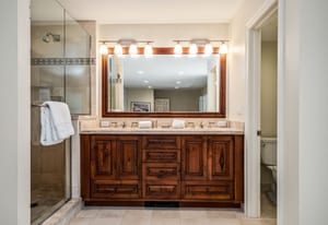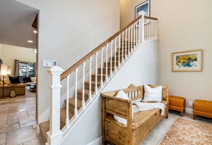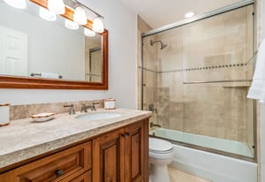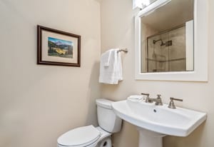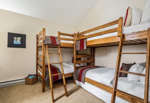 The three-bedroom, three-bathroom layout is thoughtfully arranged to support privacy, comfort, and flexible use. On the main living level, two bedrooms plus a bunk room create an easy and functional setup for hosting. One guest bedroom is a queen suite with a private en suite bath, while the bunk room is served by a three-quarter bath immediately across the hall, convenient both to the bunk room and to the main living spaces. Vaulted ceilings extend into the bunk room, adding unexpected volume and a more open feel than typically found in a flexible sleeping space.
