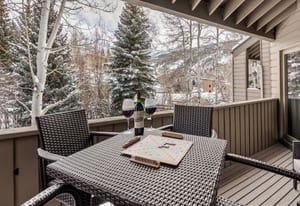 The setting is experienced directly from the covered deck and throughout the main living areas, where the home’s relationship to the landscape becomes immediately apparent. From the living room, dining area, and deck table, the view looks down across the maintained lawn and Sandstone Creek, and in winter extends across the valley to Vail Mountain and the ski slopes beyond. Sandstone Creek adds the sound and seasonal energy buyers love and typically remains approachable in scale, so even during spring runoff, it feels inviting rather than overwhelming like some of the larger waterways in town. During the warmer months, mature trees and lush greenery soften the distant slope views, shifting the visual focus to the creek, lawn, and outdoor living areas below.
