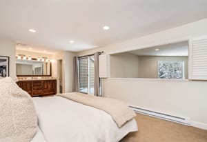 The upper level is dedicated entirely to a spacious primary suite that functions as a true private retreat. Vaulted ceilings, abundant natural light, and generous proportions that easily accommodate a king bed with room to spare give the suite a sense of scale that is rarely achieved in condominium living. The primary bathroom features a dual vanity with slab travertine countertops, a separate commode area, and a European-style glass shower finished in travertine stone tile. A large private deck extends the suite outdoors, reinforcing the connection to the creek and seasonal views below.