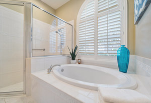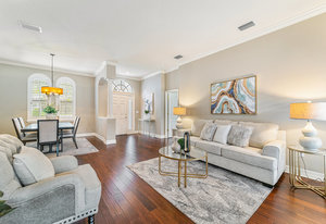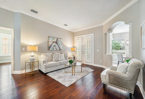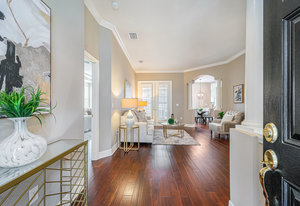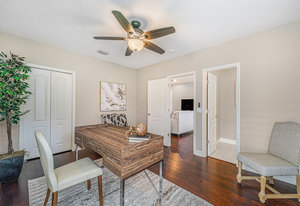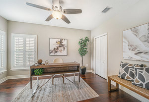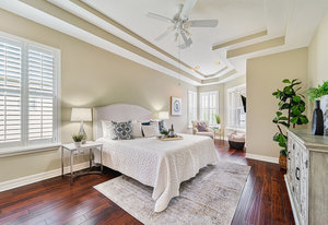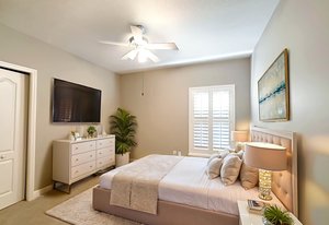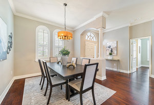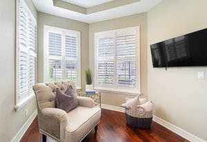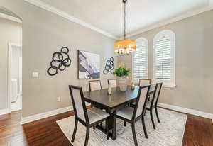 Throughout the home, architectural details elevate the experience. Wood flooring, plantation shutters, decorative columns, a tray ceiling, and crown molding add warmth and dimension, while a cohesive neutral décor creates a timeless canvas ready to reflect any personal style.