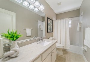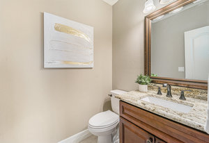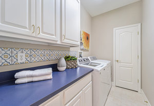 Additional bedrooms are thoughtfully placed within the split plan, including a secondary bedroom with an en-suite half bath, ideal for guests or a private flex space. A well-equipped laundry room with additional cabinetry adds functionality, with washer and dryer included.