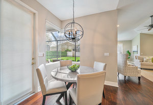 Outdoors, a screened patio with pavers extends the living space, offering a peaceful backdrop for morning coffee or evening gatherings. The setting feels private yet connected, echoing the balance Deer Creek is known for.