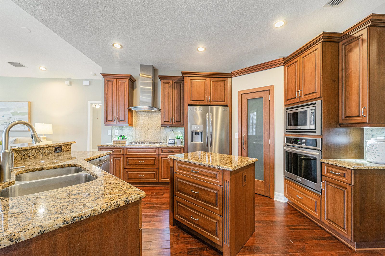At the center, the chef's kitchen commands attention without demanding it. Features include elegant, 42-inch upgraded wood cabinetry, granite countertops, stainless steel appliances that convey, wall ovens, a gas range with a decorative stainless steel hood, and a walk-in pantry come together around a central island, creating a space that supports both casual mornings and memorable evenings. Overlooking the family room, the kitchen allows conversations to flow as naturally as the layout itself.