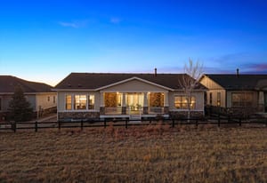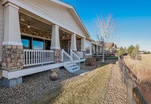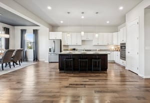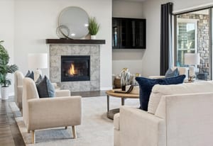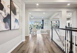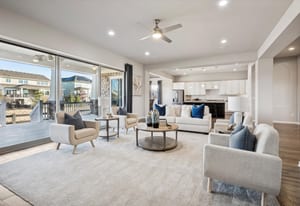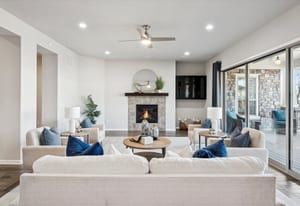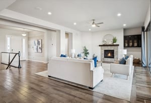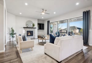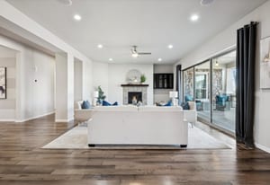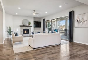 A wide foyer with warm wood engineered hardwood flooring leads into a light-filled great room enhanced by surround sound, a custom mantle, and remote-controlled shades. Dramatic 15-foot multi-panel sliding glass doors open to a covered deck, creating a seamless indoor-outdoor living experience ideal for year-round enjoyment.