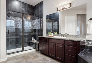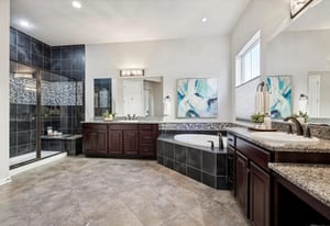 The main level offers a versatile bonus room ideal for an office or additional bedroom, a stylish powder bath, a private guest suite with walk-in closet and en-suite bath, and a serene primary suite with blackout shades, dual vanities, soaking tub, tiled shower, and a spacious walk-in closet.