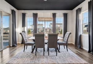 The gourmet kitchen features a large eat-in island, slab granite countertops, abundant cabinetry, stainless steel appliances, and a walk-in pantry. The adjacent dining area is surrounded by windows and opens directly to the deck, perfect for entertaining.