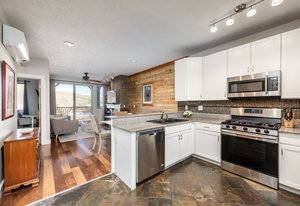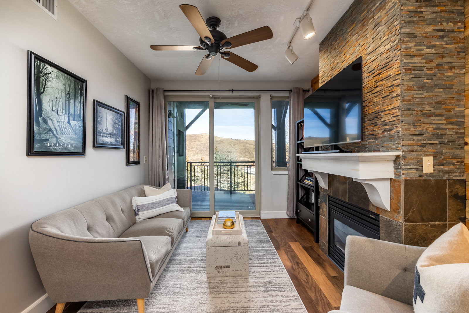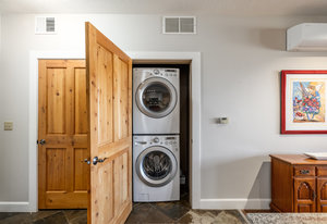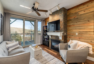 Step outside through sliding glass doors to a covered deck—an ideal extension of the living space and a perfect place to enjoy fresh mountain air in every season. The primary suite features an ensuite bath and a spacious walk-in closet, while in-unit stackable laundry adds everyday ease.