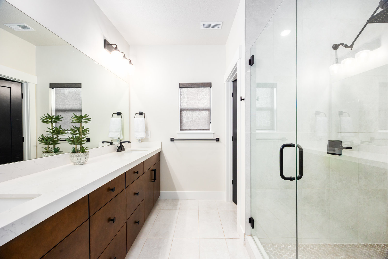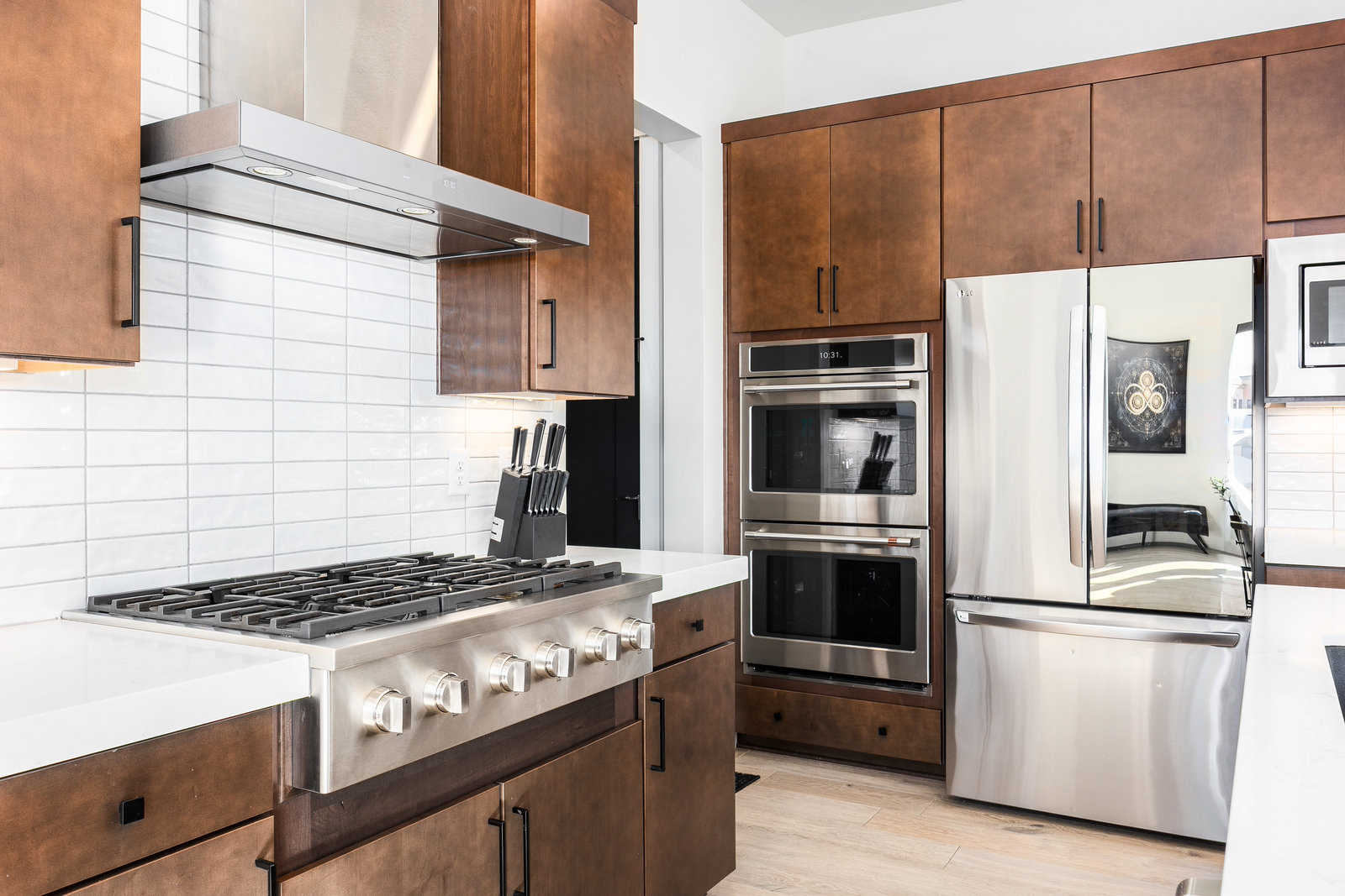 Upgrades include highest-tier hardwood flooring, Level 4 quartz countertops throughout, and a chef’s kitchen featuring GE Café Series smart appliances and a black anthracite undermount sink. The great room is highlighted by a modern shiplap fireplace, while custom lighting and dimmer-controlled zones across three levels enhance the home’s contemporary style.