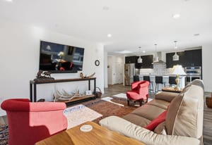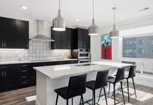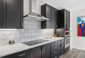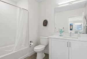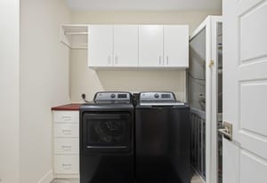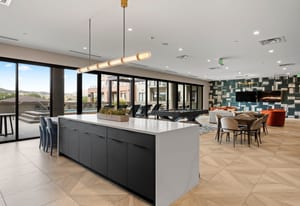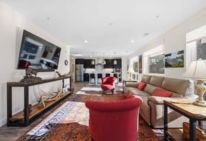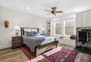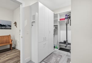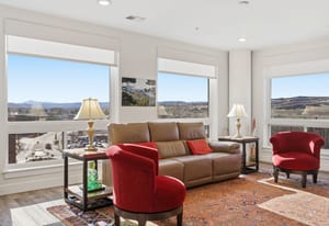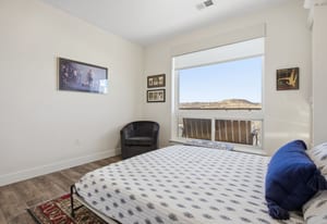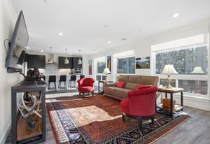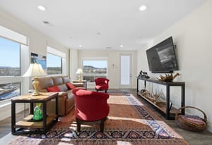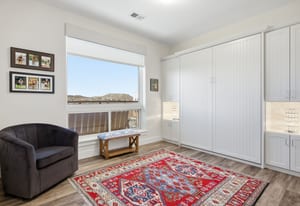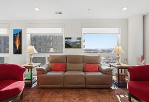 The versatile secondary bedroom includes custom cabinetry and a Murphy bed—perfect for guests, a home office, or den—with a full guest bath conveniently nearby. An in-unit laundry room adds everyday functionality. The gourmet kitchen is outfitted with upgraded JennAir appliances and designer finishes, flowing into a spacious open floor plan ideal for entertaining or relaxing evenings at home. Expansive windows with motorized shades and semi-blackout UV-protective film enhance comfort and privacy.