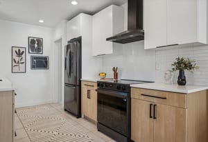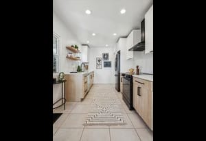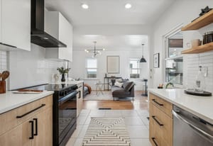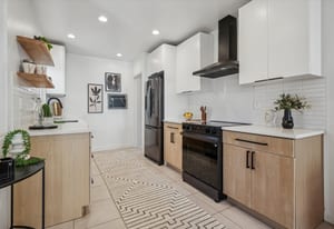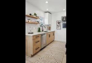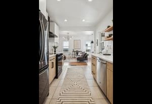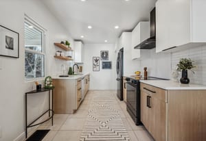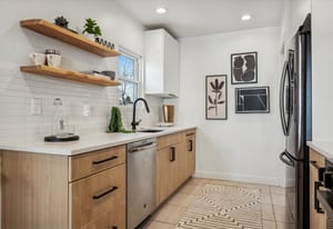 Those who love to cook and entertain, will fall in love with the open floor plan featuring living/dining spaces that flow into the kitchen. The kitchen is a true showstopper, featuring sleek quartz countertops, European-style cabinetry, stainless steel appliances, and open shelves.