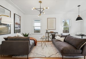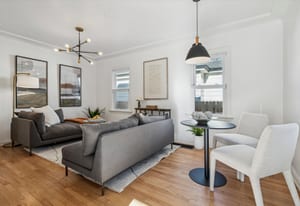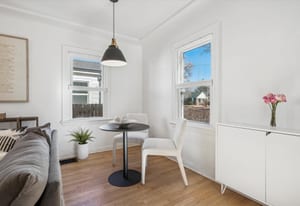 light fixtures that add a unique artistic flair. The cozy dining nook provides the perfect spot for meals and gatherings.