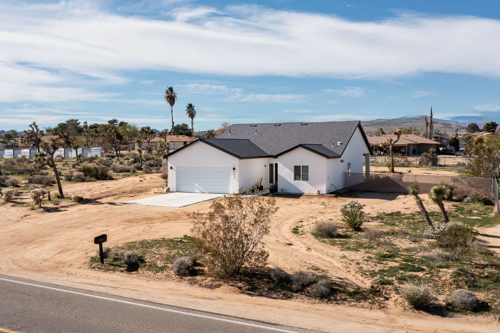 Experience modern desert living in this newly built modern farmhouse on the Mesa. Inside, a bright open-concept layout pairs comfort with style, featuring wood plank flooring, composite countertops, farmhouse-inspired finishes, and modern appliances. The spacious kitchen is designed for everyday living and entertaining with breakfast bar seating, a double-basin sink, and a walk-in pantry. The primary suite offers abundant natural light, a generous walk-in closet, and a private bathroom with a walk-in shower. Three additional bedrooms - each with large closets - provide flexibility for family, guests, or a dedicated home office. Step outside to an expansive backyard ready for you to create your own desert oasis - ideal for enjoying wide-open skies and golden sunset evenings. Additional highlights include paid solar, central heating and cooling, energy-efficient construction, RV parking, and a two-car garage for extra storage and convenience. Conveniently located within walking distance to Yucca Mesa Elementary School and within 10-15 minutes to local restaurants, shopping, and the Joshua Tree National Park entrance. This move-in ready home is ready for its new owner - offering the perfect blend of comfort, style, and desert tranquility. Schedule your showing toady! ** Seller is in the process of installing landscaping and privacy fence at the front of the home, to be installed prior to close of escrow. Wood fence shown in marketing is a conceptual rendering only and is not currently installed. **