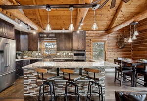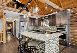 heart of the home, featuring knotty alder cabinetry, quartz countertops, a large island