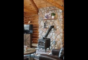 and contemporary lighting. Year-round comfort is provided by two wood-burning stoves,