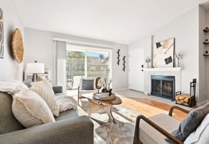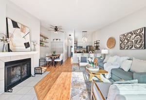 The light-filled interior features a cozy wood-burning fireplace, a spacious open layout, and a fully remodeled kitchen (2024) with contemporary finishes and ample storage. Recent upgrades include brand-new energy-efficient windows and sliding door (2025), updated light fixtures, and a stylish ceiling fan for added comfort and ambiance.
